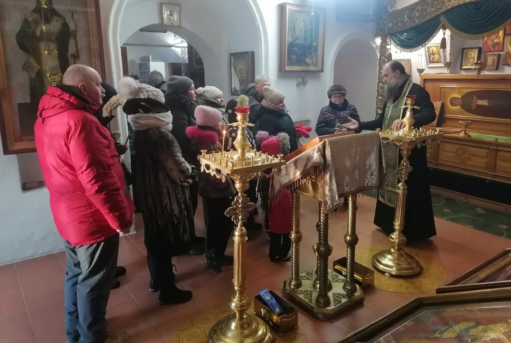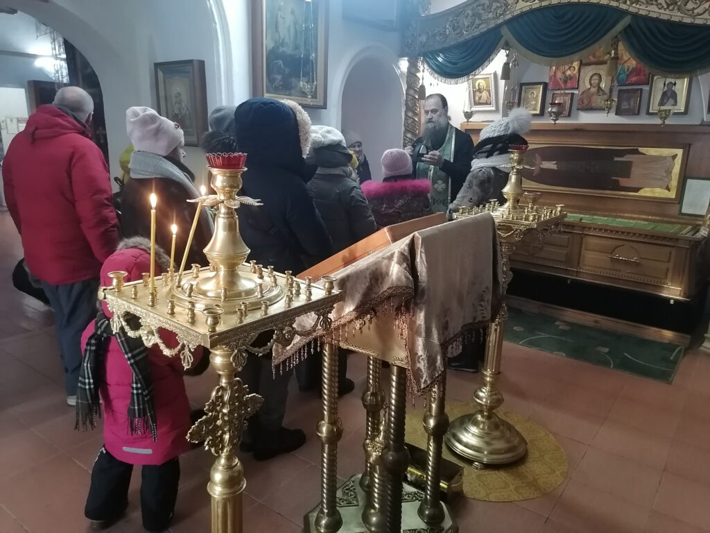 Сегодня храм посетила группа паломников из г. Москвы. Настоятель храма протоиерей Георгий Титов провел беседу о мощах прп. Феодосия, помазал святым маслом и положил на головы шапочку.