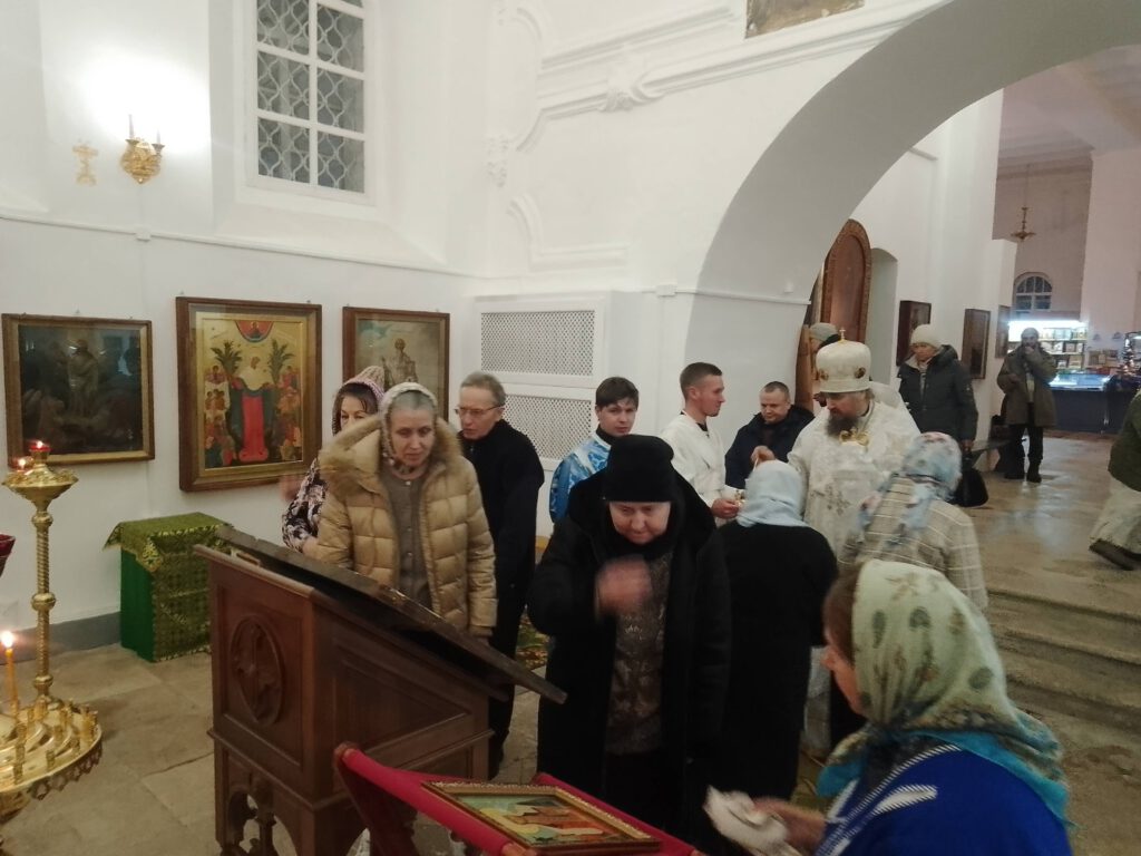 Его Преосвященству сослужил иерей Олег Викторов, настоятель храма Благоверного князя Александра Невского с. Кичменский Городок. На утрене, после чтения Евангелия, Владыка совершил помазание верующих освященным елеем.