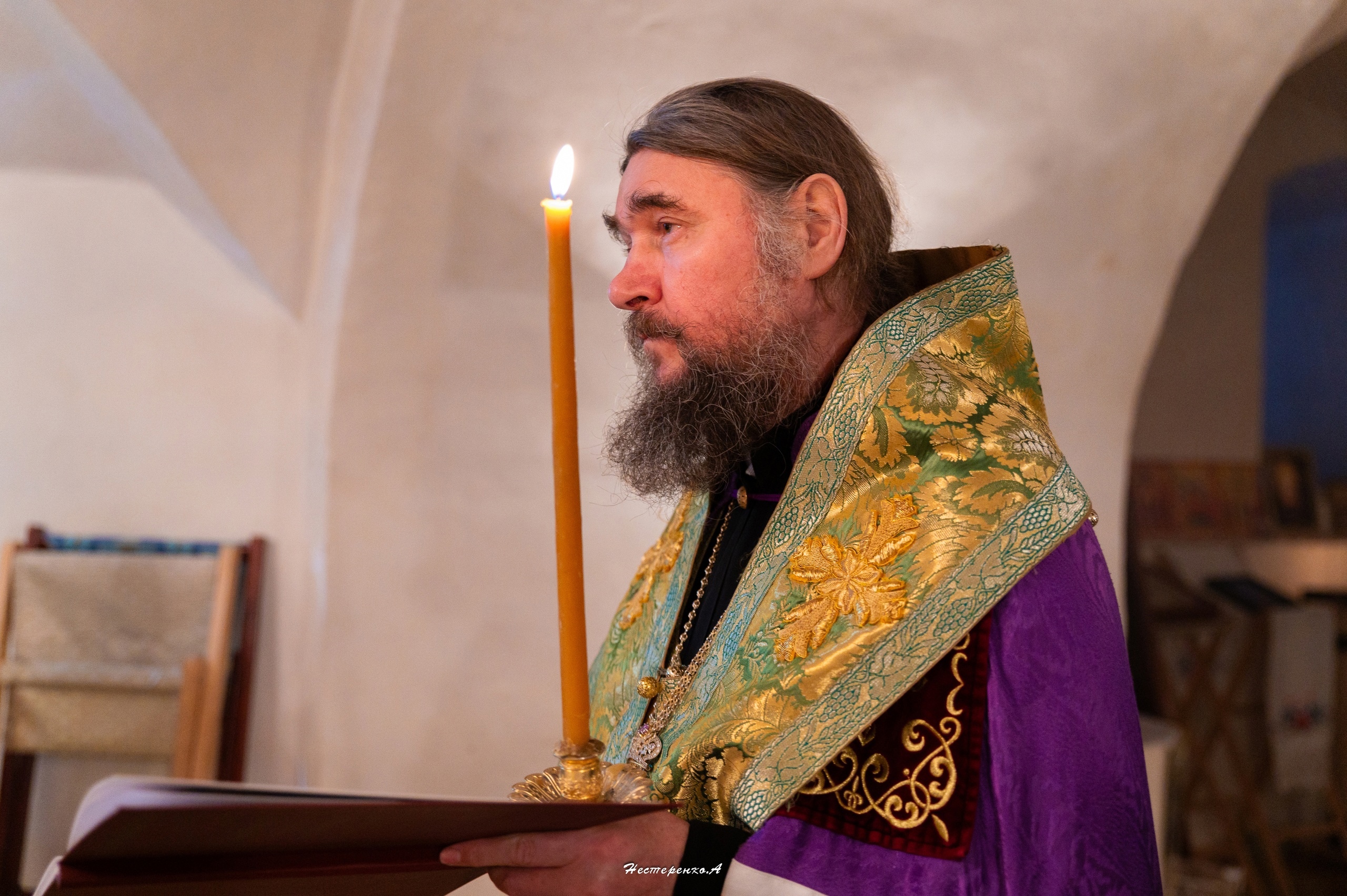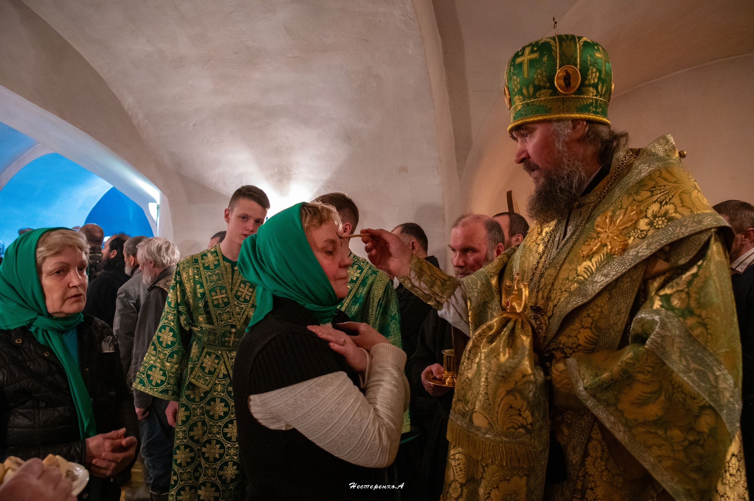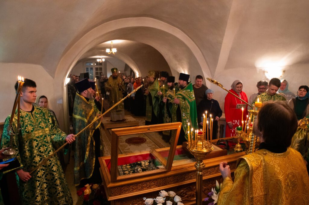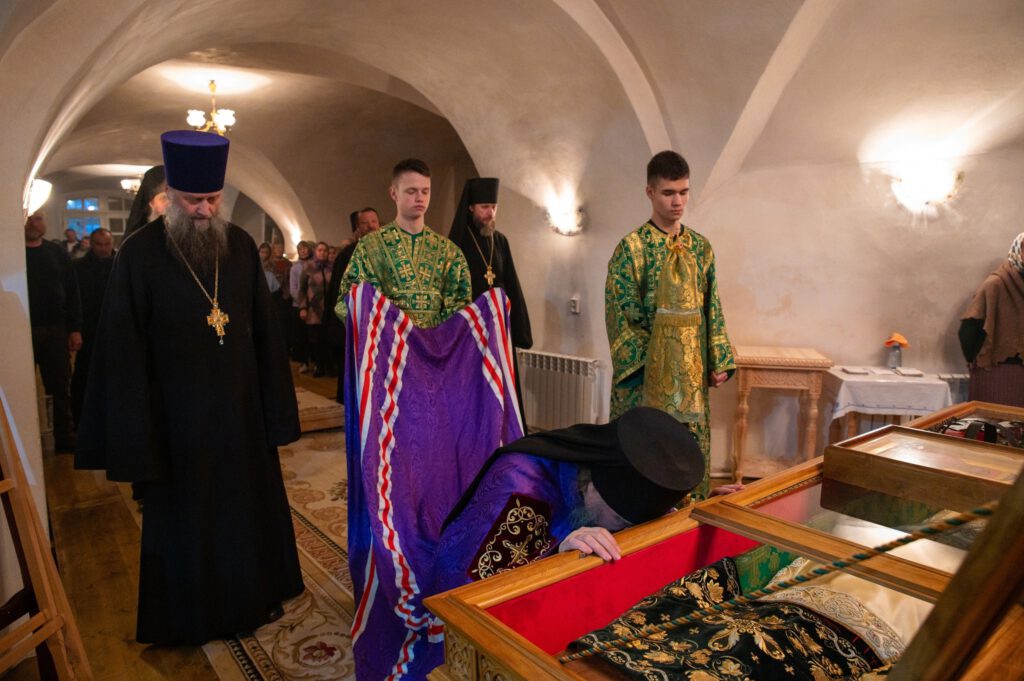 Все молящиеся в храме приложились к открытым мощам преподобного Феодосия, владыка Фотий каждого помазал освященным елеем.