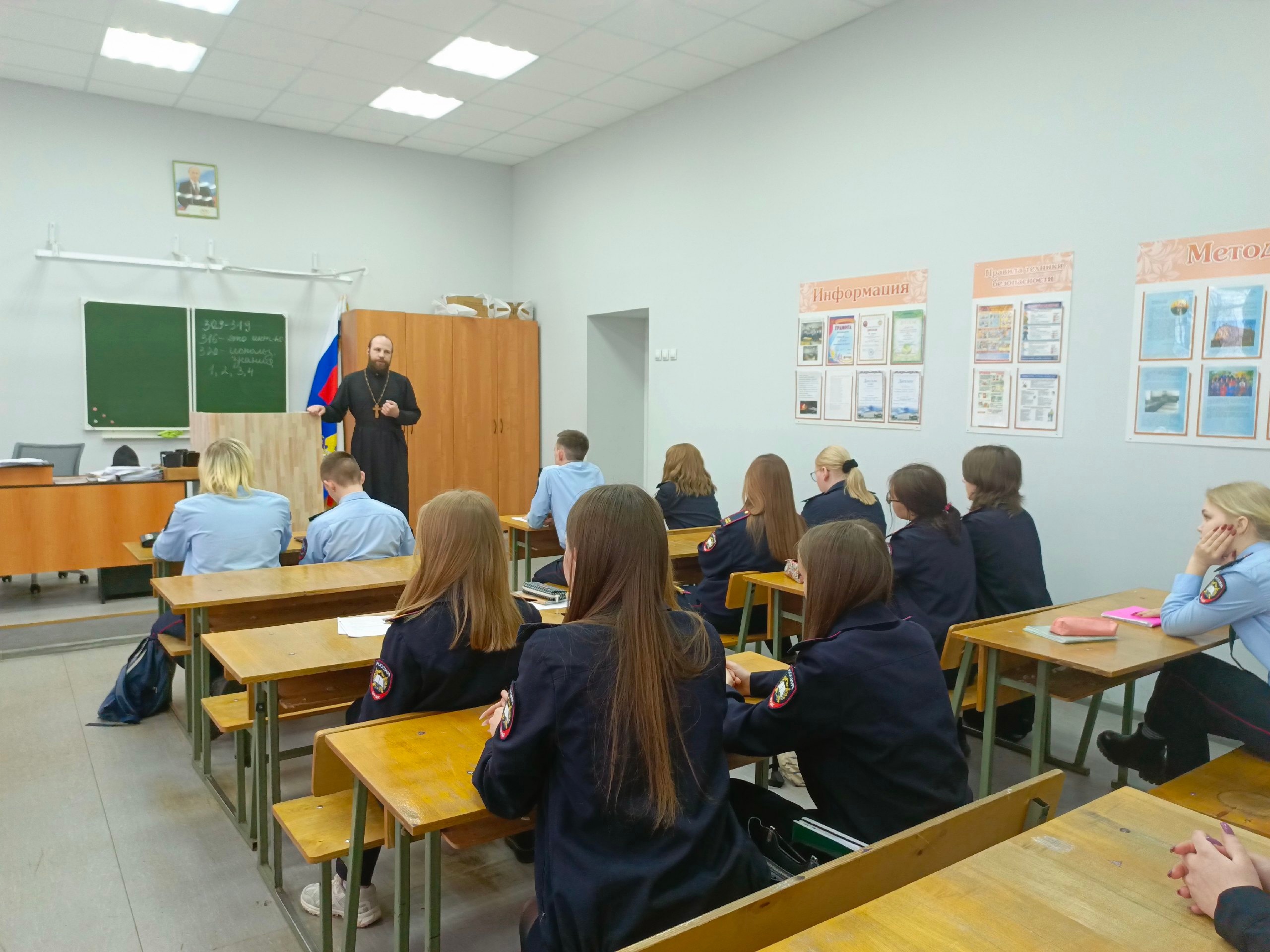 Отец Фёдор побеседовал с подростками не только о служении своему делу, но и о служении Богу, в том числе и на рабочем месте. О том, что получив образование, человеку следует не просто работать по выбранному направлению, но честно служить своему народу. Особенно это касается будущих юристов, полицейских, и сотрудников исправительных учреждений, которыми уже через несколько лет могут стать нынешние первокурсники. Также священник упомянул и о том, как важно современному человеку любить ближнего, уметь быть милосердным и проявлять сострадание.