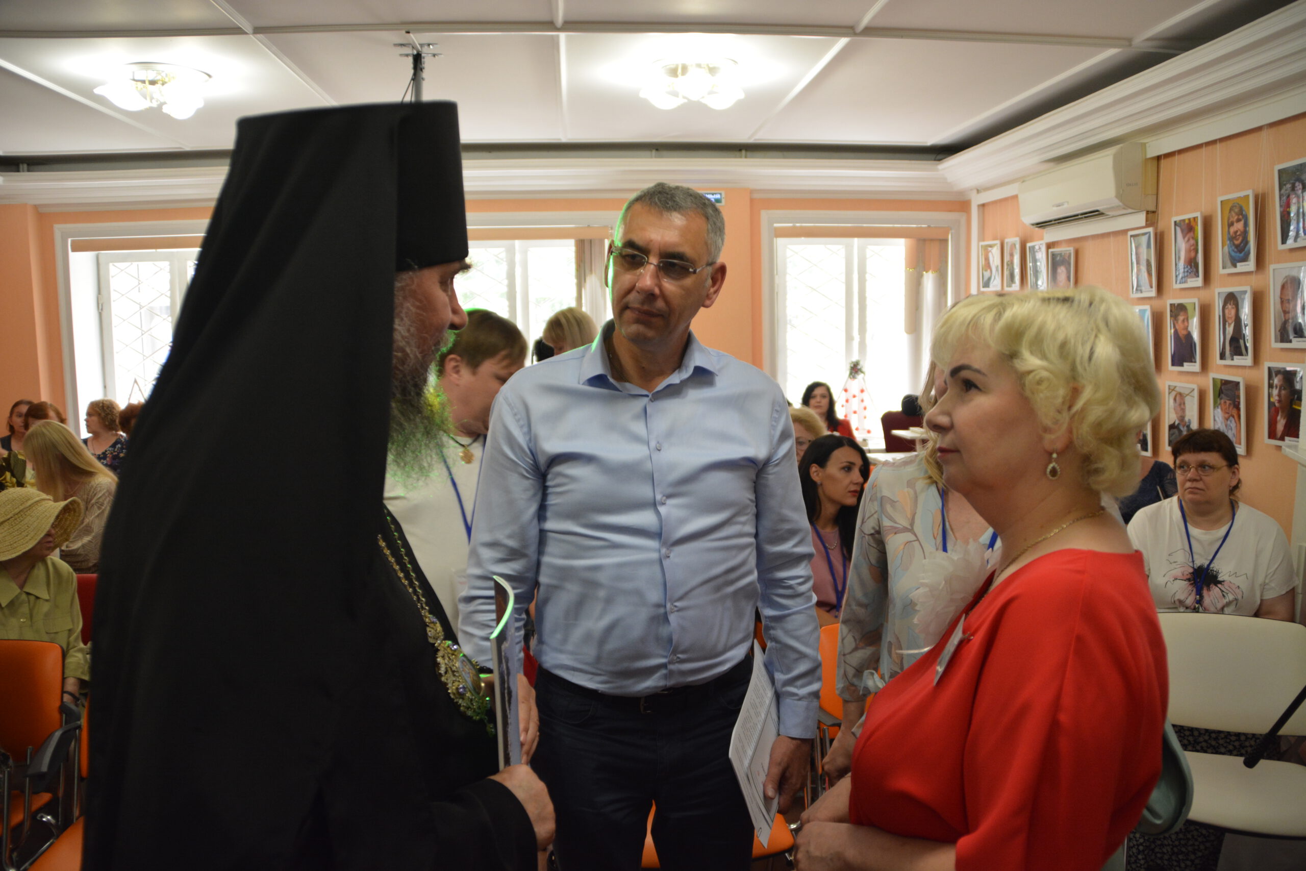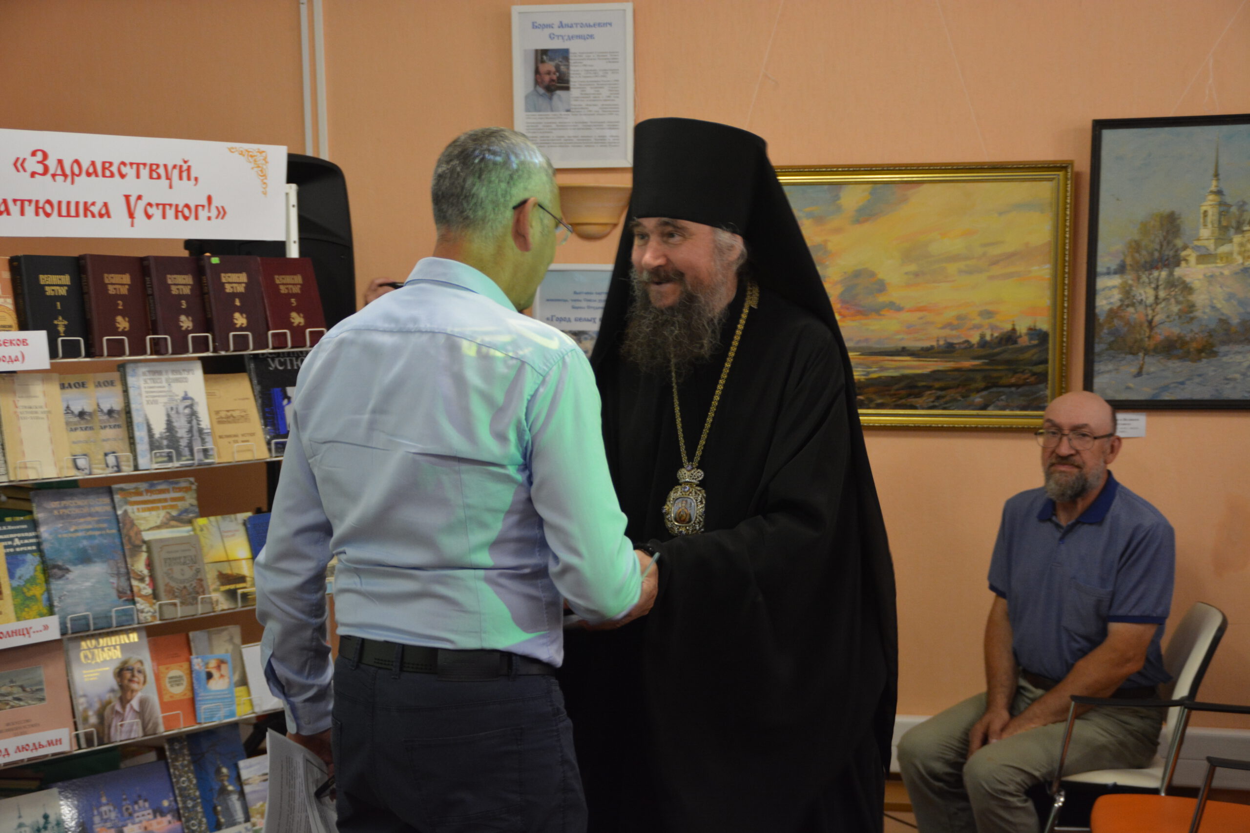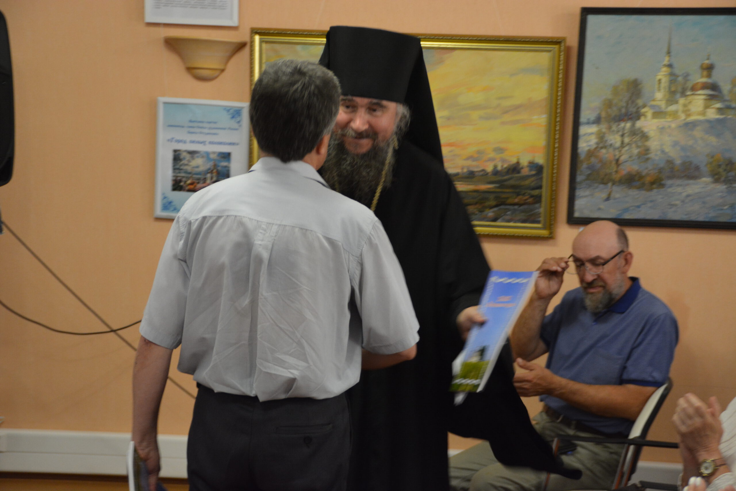 От одного из докладчиков, ученого секретаря Котласского краеведческого музея Сергей Александровича Гладких, владыка Фотий получил в подарок недавно вышедшую в свет книгу «Храмы Котласского округа».