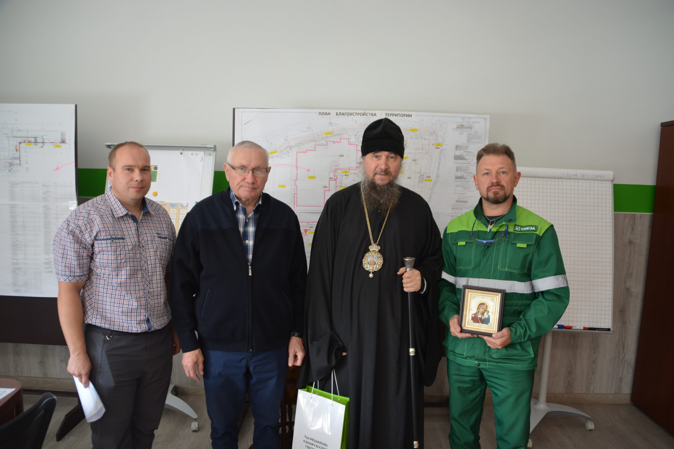 В минувшую пятницу Преосвященный Фотий посетил предприятие «Свеза» в Новаторе, где провёл деловую встречу с руководителем предприятия Евгением Михелем. Евгений Леонидович тепло поприветствовал архиерея, а владыка Фотий преподнёс Евгению Леонидовичу подарок — икону Богородицы. Вместе с предпринимателем Владимиром Кадомкиным епископ Фотий и Евгений Михель обсудили варианты взаимодействия в частности, в области сохранения и реставрации храмов на территории Великоустюжской епархии.