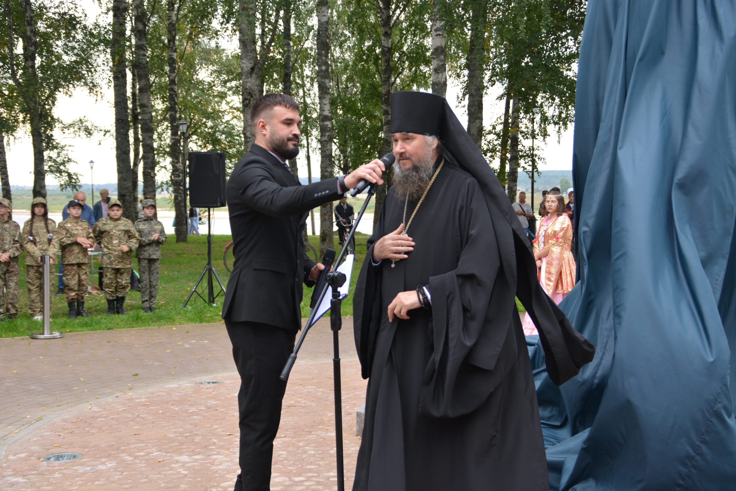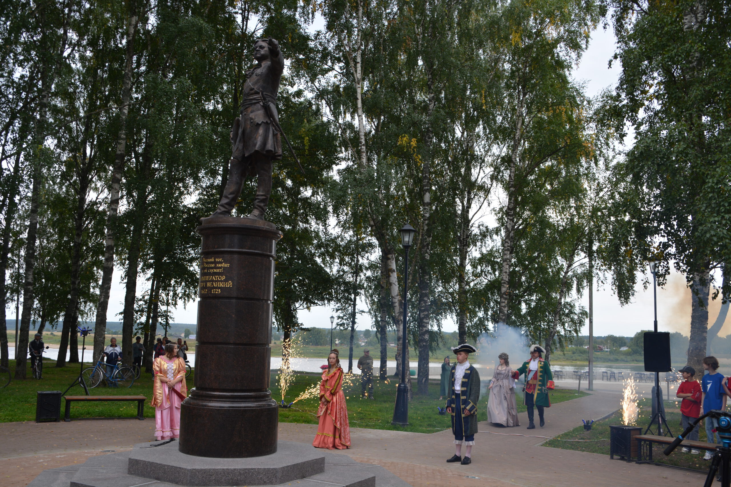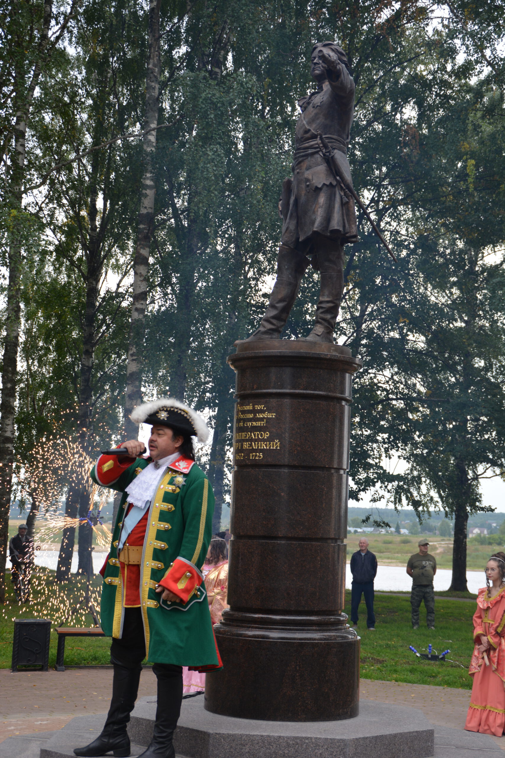 Субботним утром 24 августа множество устюжан собрались в сквере неподалёку от Никольской церкви. Здесь состоялась церемония открытия памятника императору Петру I. Пётр Великий несколько раз посещал Великий Устюг и организовал в Орловской роще посадку деревьев, подходящих для использования в качестве корабельных мачт. Инициатором установки памятника царю-реформатору стал устюжский предприниматель и меценат Василий Михайлович Перевалов. Почётным гостем церемонии стал Преосвященный Фотий. Владыка удостоился чести вместе с Василием Переваловым снять с памятника покрывало и явить его устюжанам.