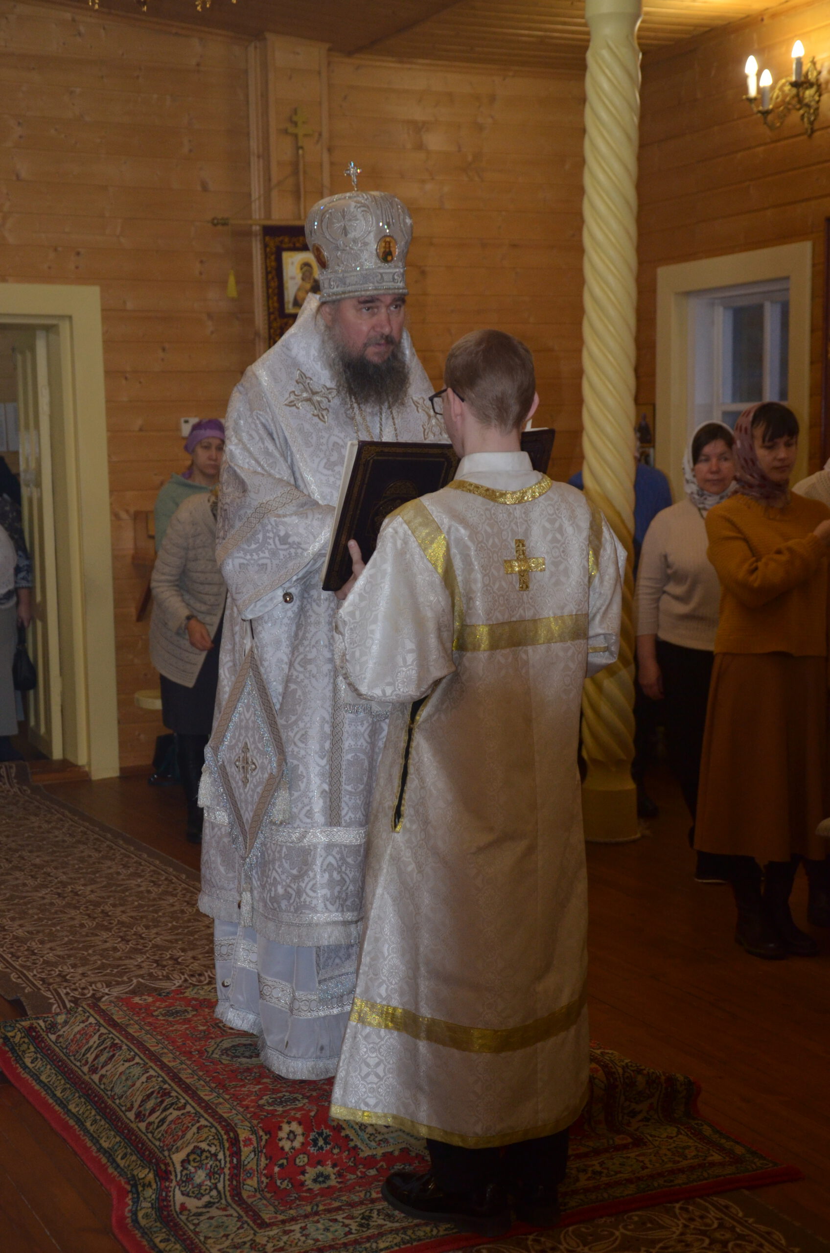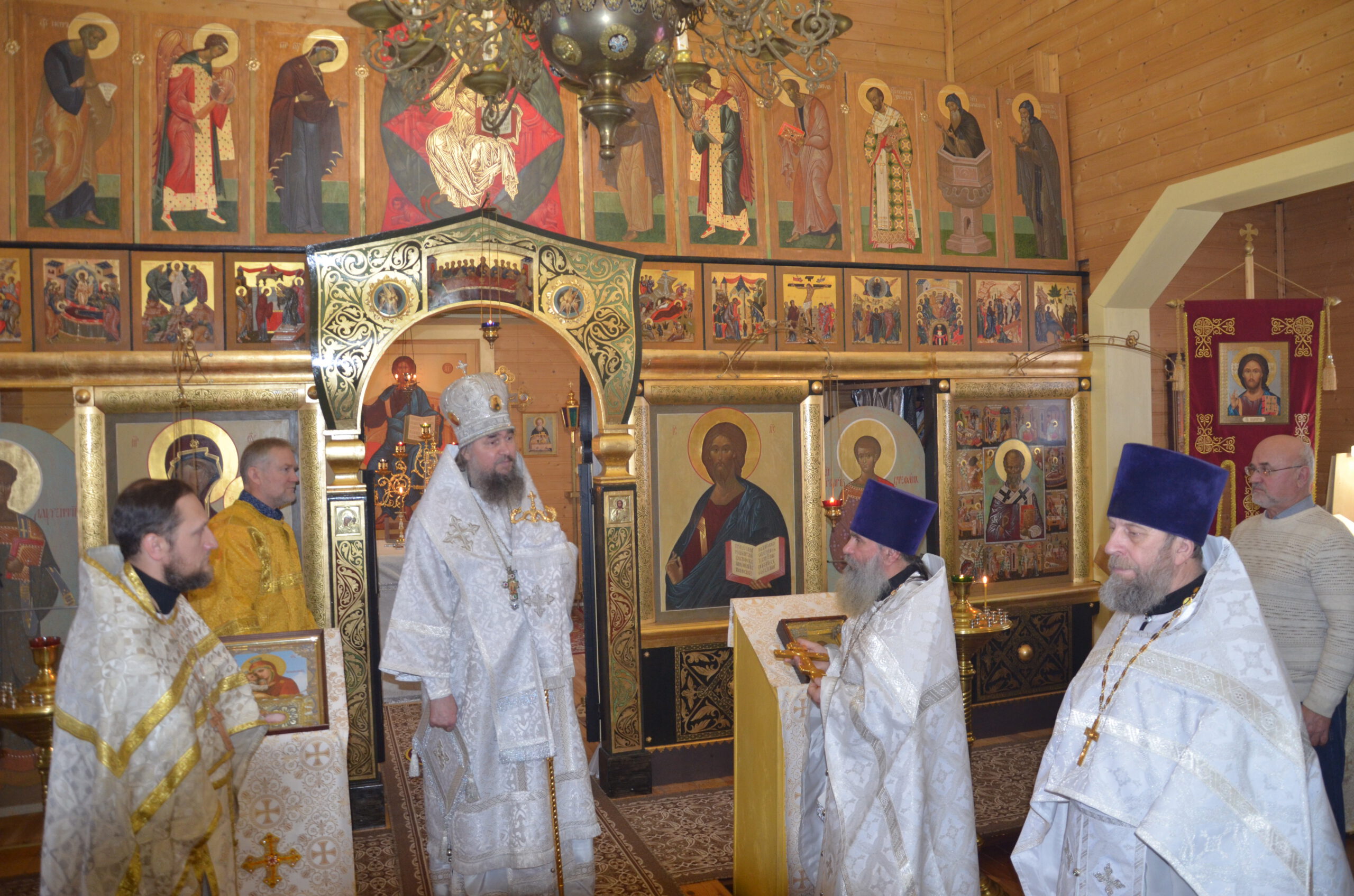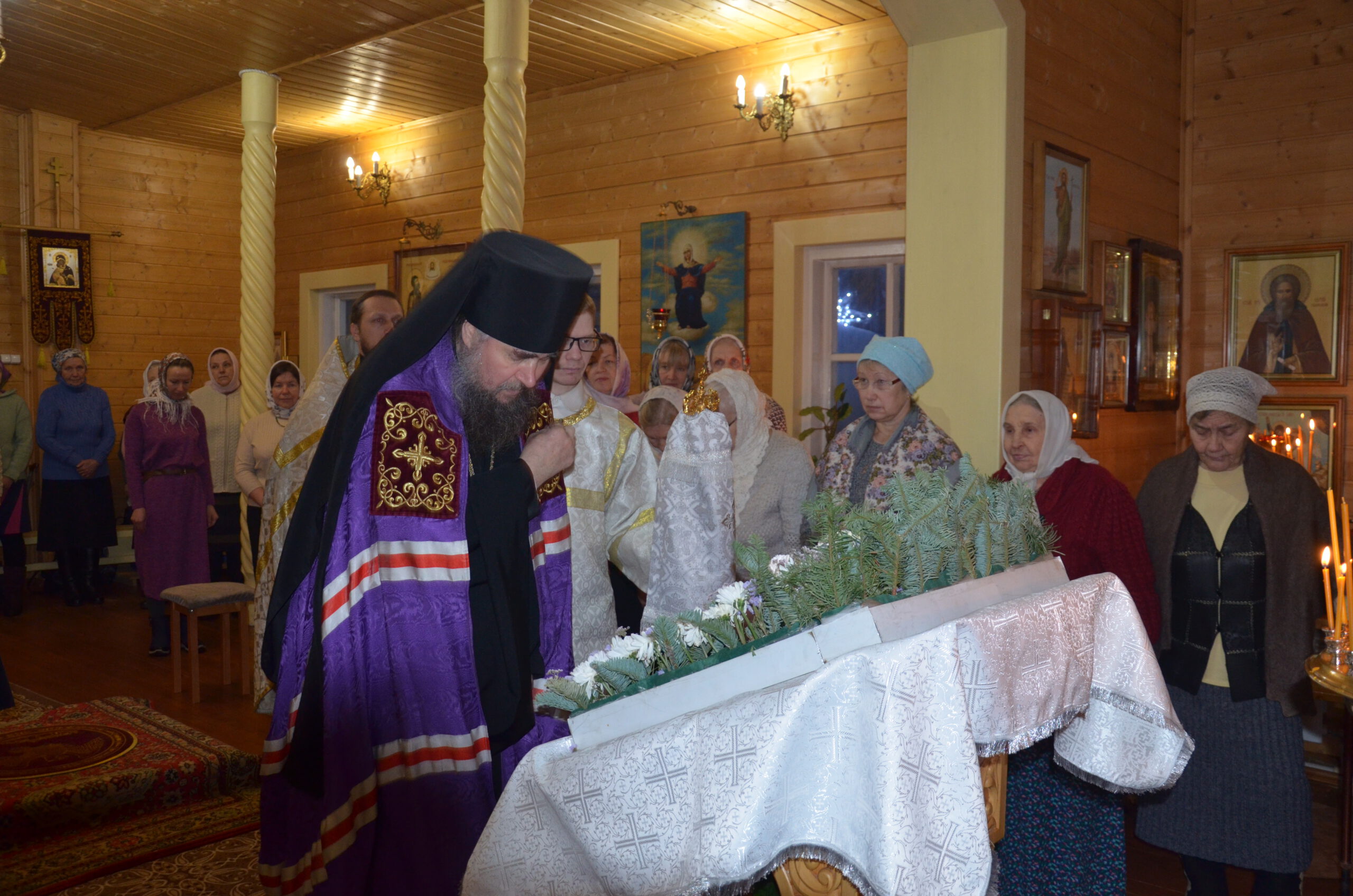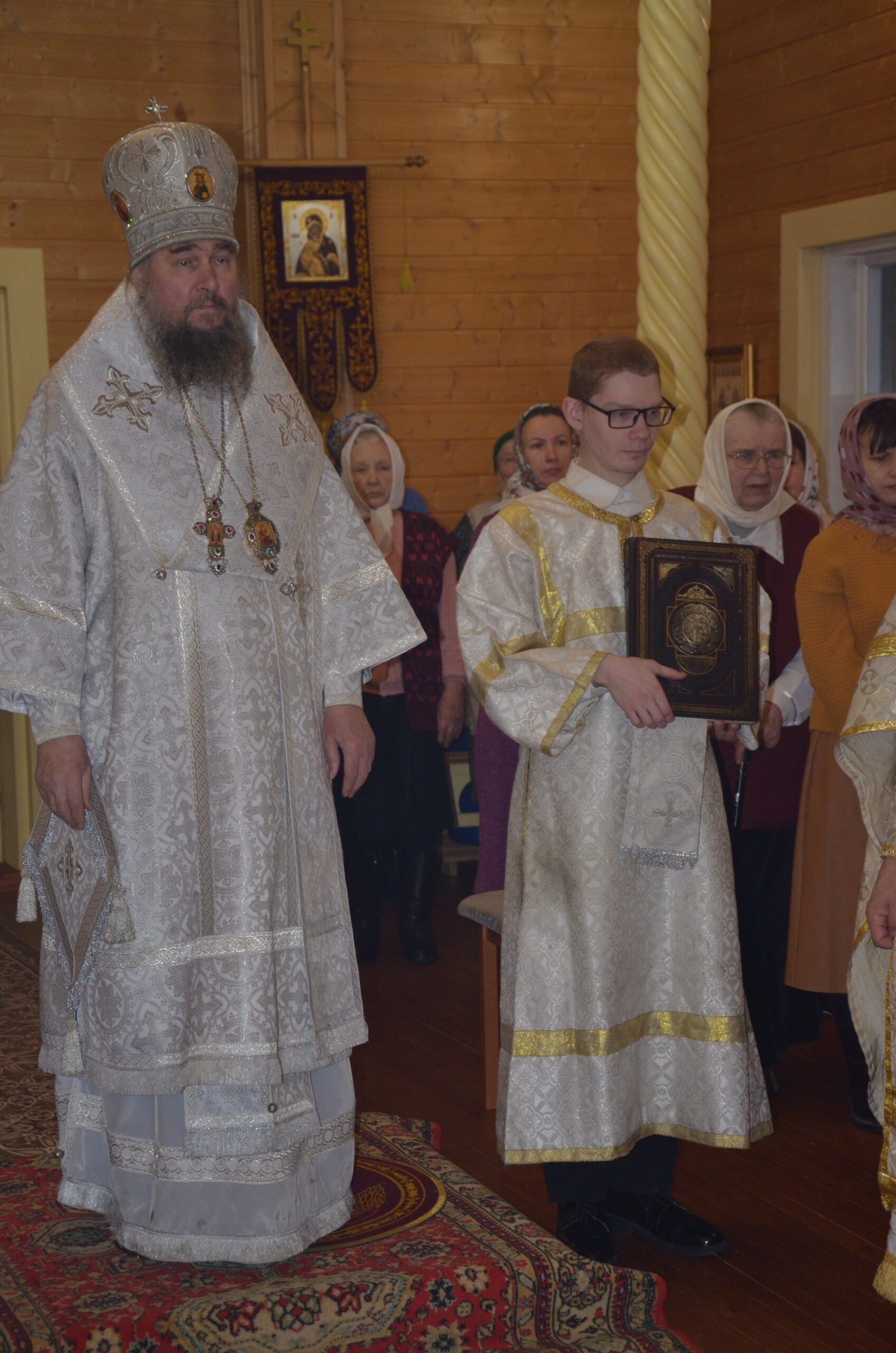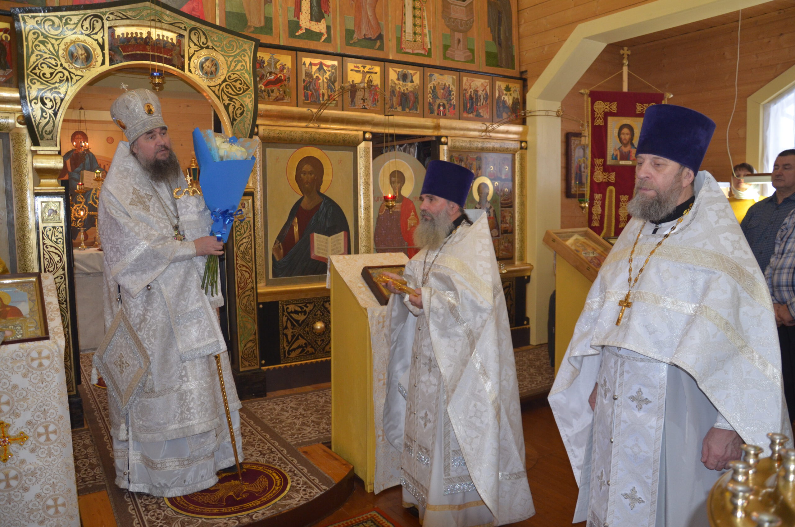 Владыке сослужили: благочинный Тарногского округа протоиерей Николай Кручёных, настоятель храма Агапита Маркушевского в Нюксенице иерей Максим Кривошанов , настоятель храма Богоявления Господня в Городишне иерей Александр Чудинов.