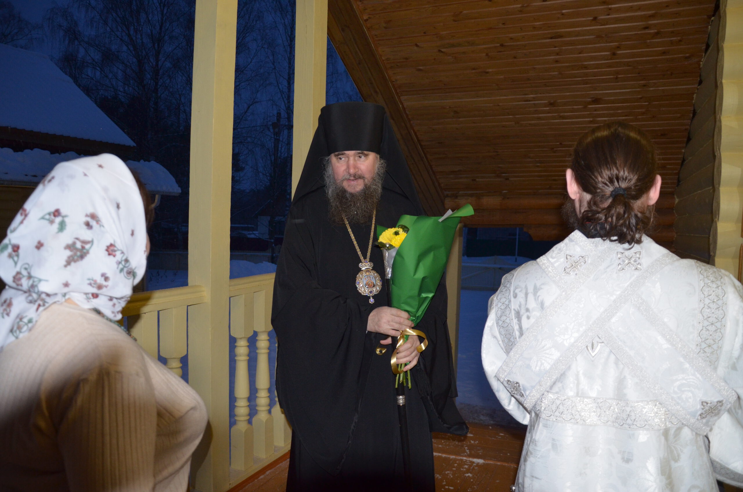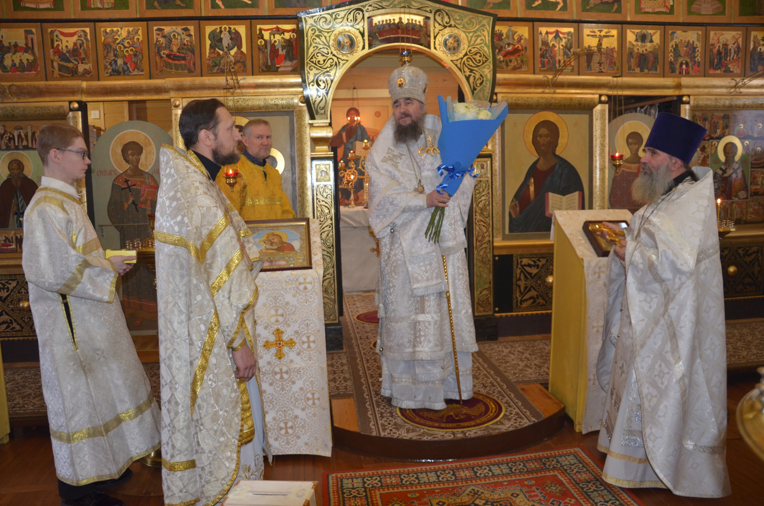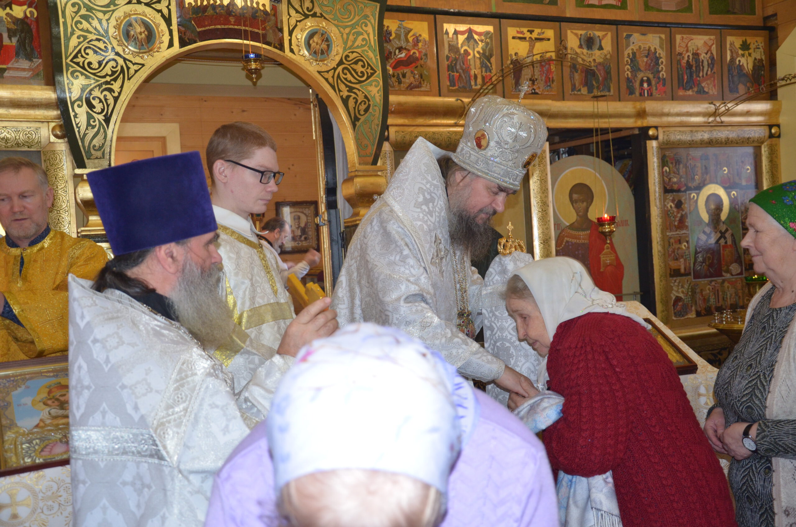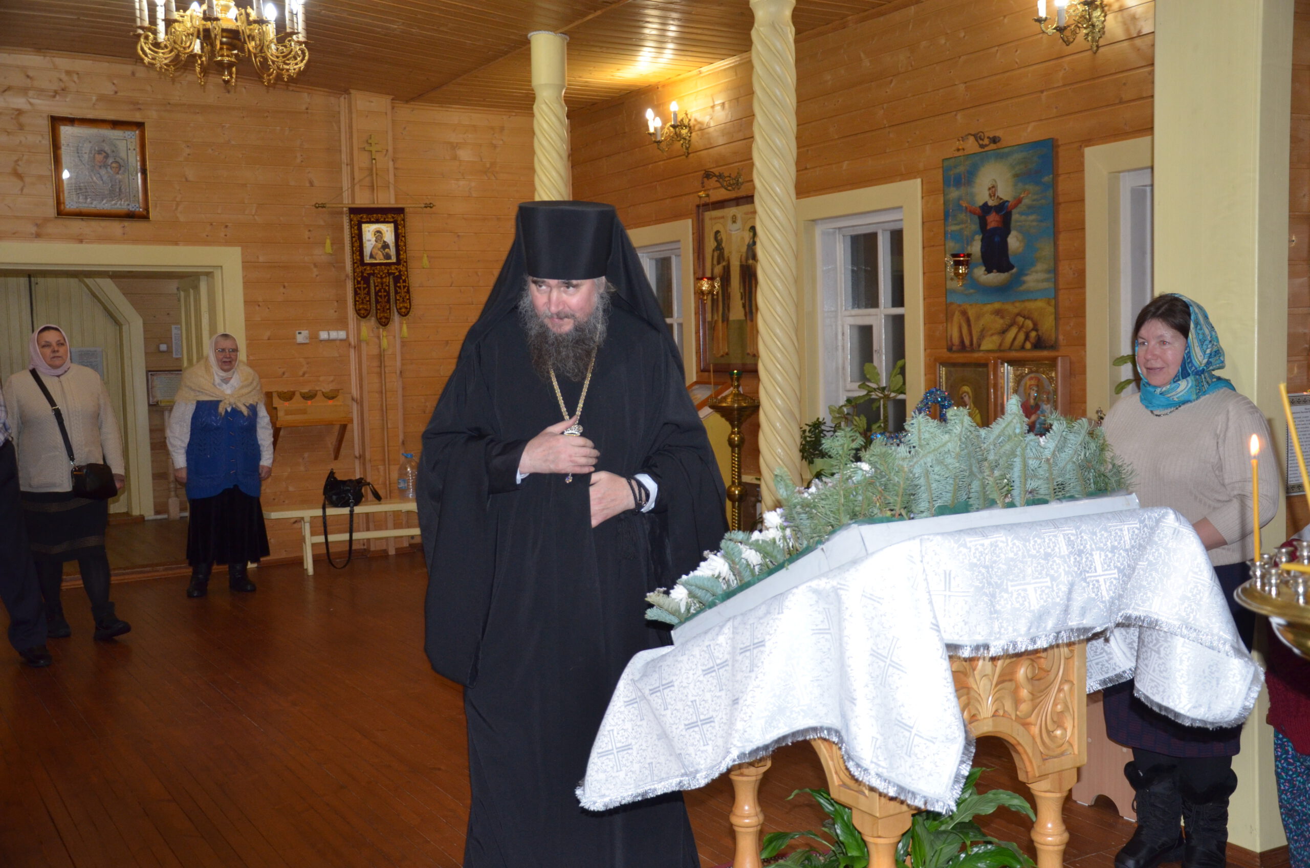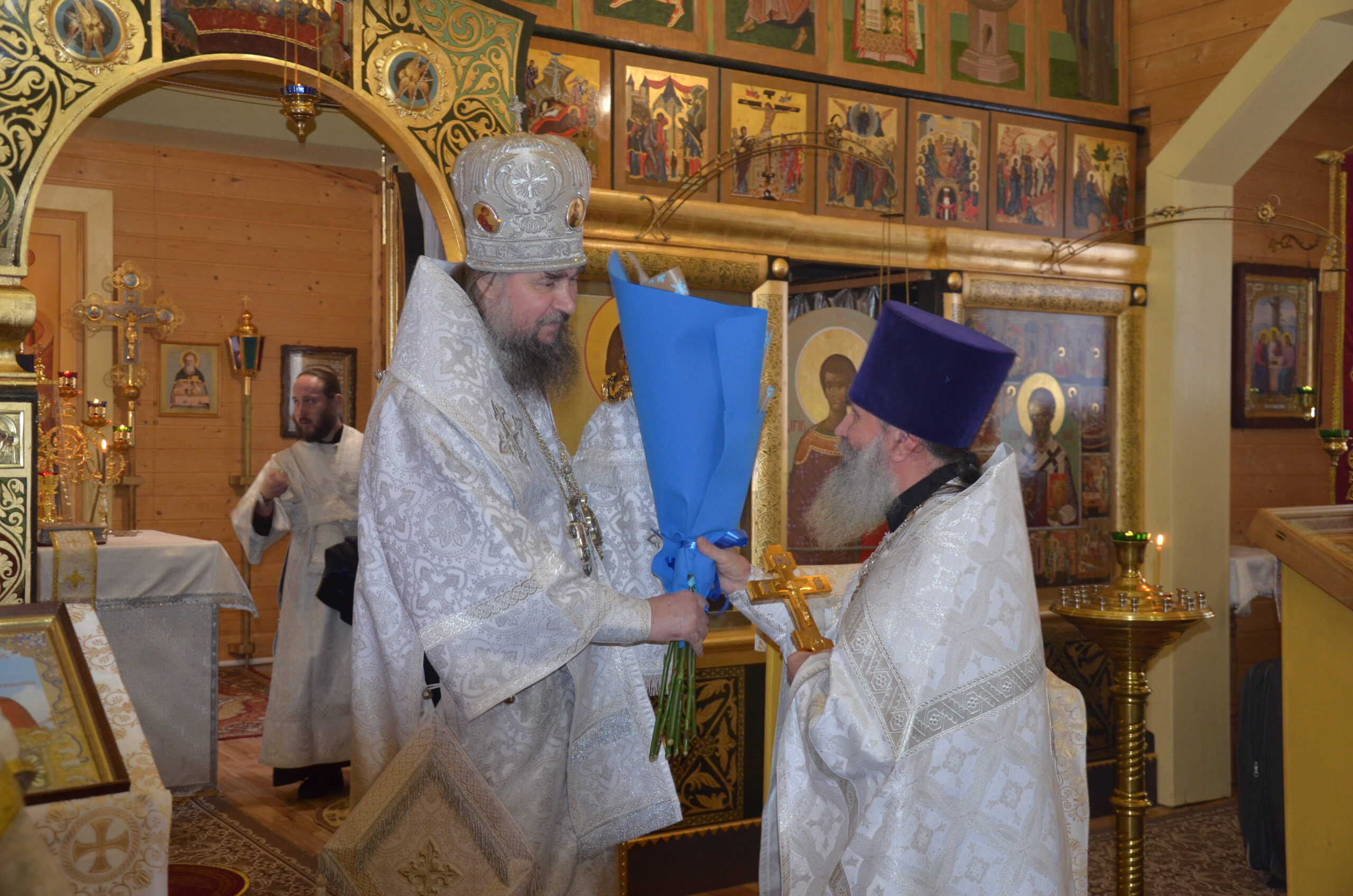Владыке сослужили: благочинный Тарногского округа протоиерей Николай Кручёных, настоятель храма Агапита Маркушевского в Нюксенице иерей Максим Кривошанов , настоятель храма Богоявления Господня в Городишне иерей Александр Чудинов.