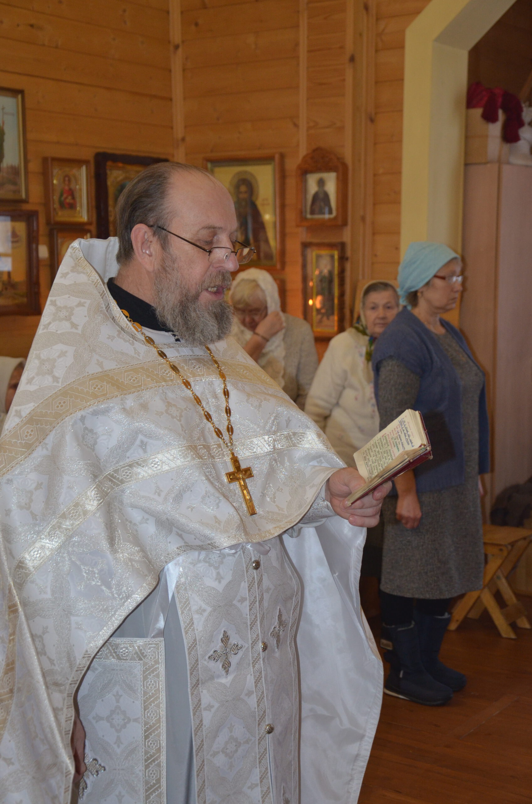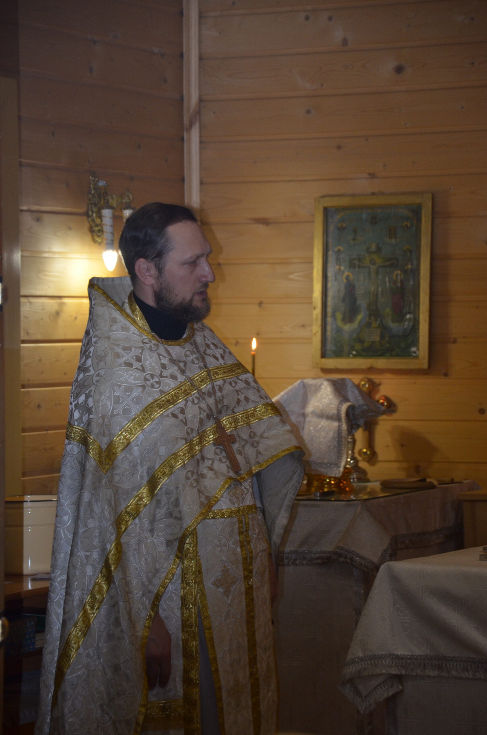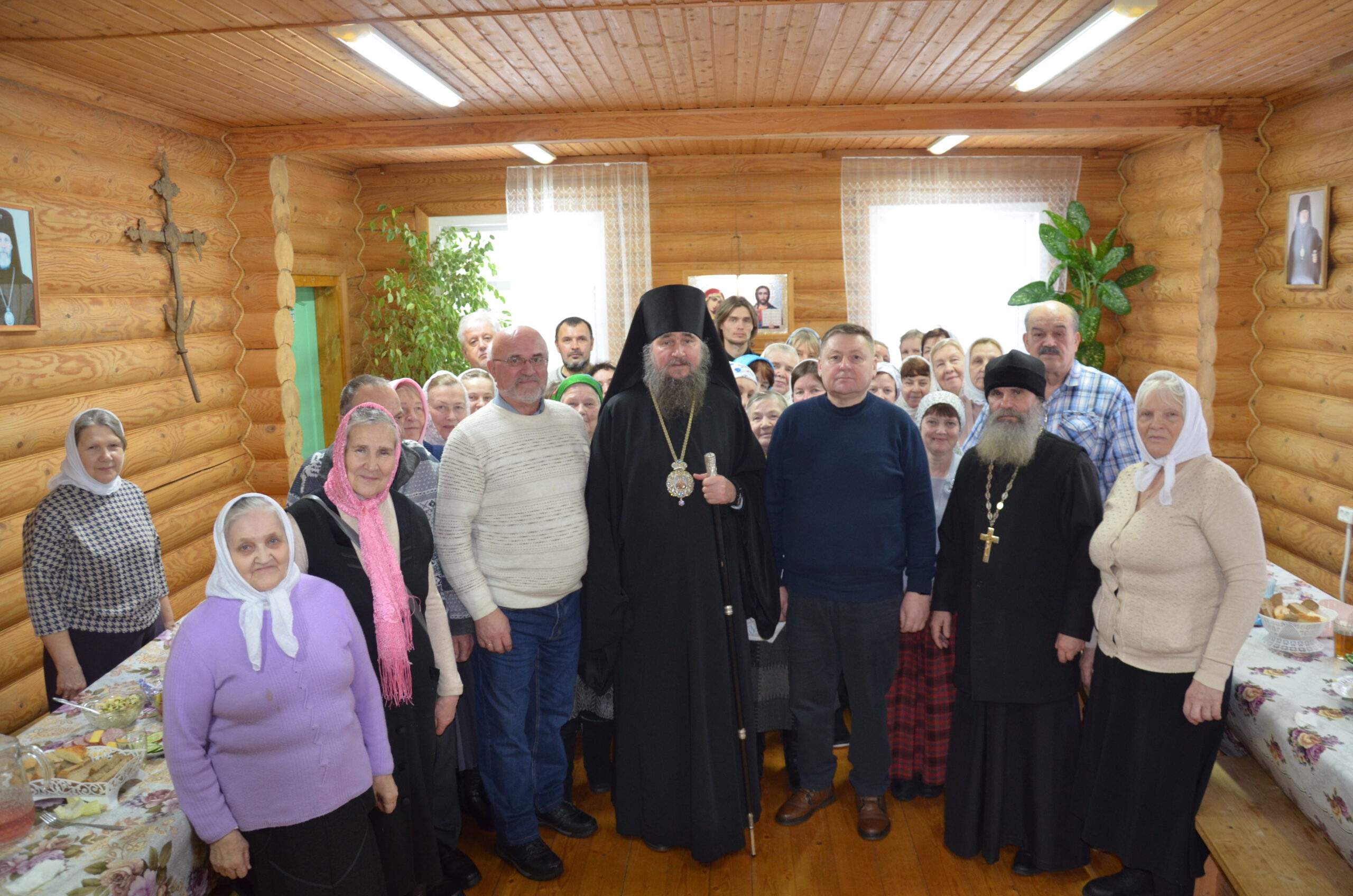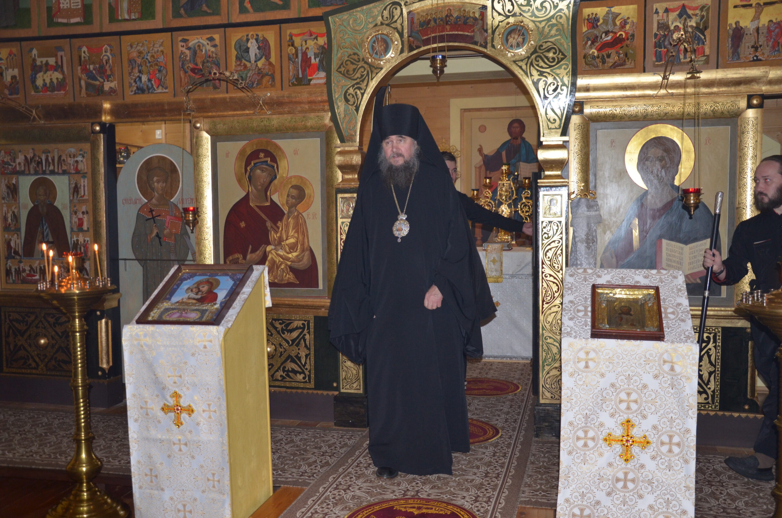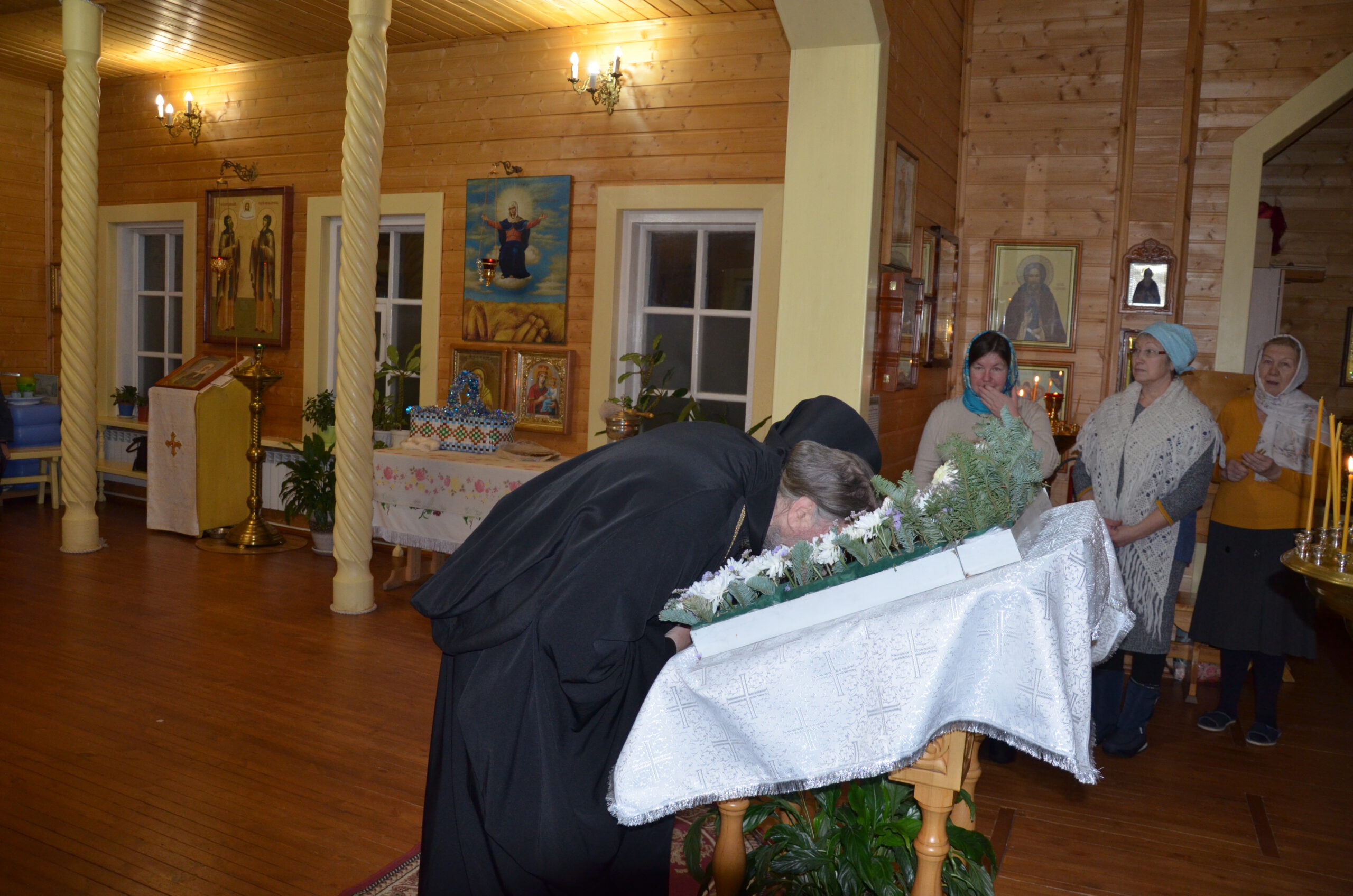 Владыке сослужили: благочинный Тарногского округа протоиерей Николай Кручёных, настоятель храма Агапита Маркушевского в Нюксенице иерей Максим Кривошанов , настоятель храма Богоявления Господня в Городишне иерей Александр Чудинов.