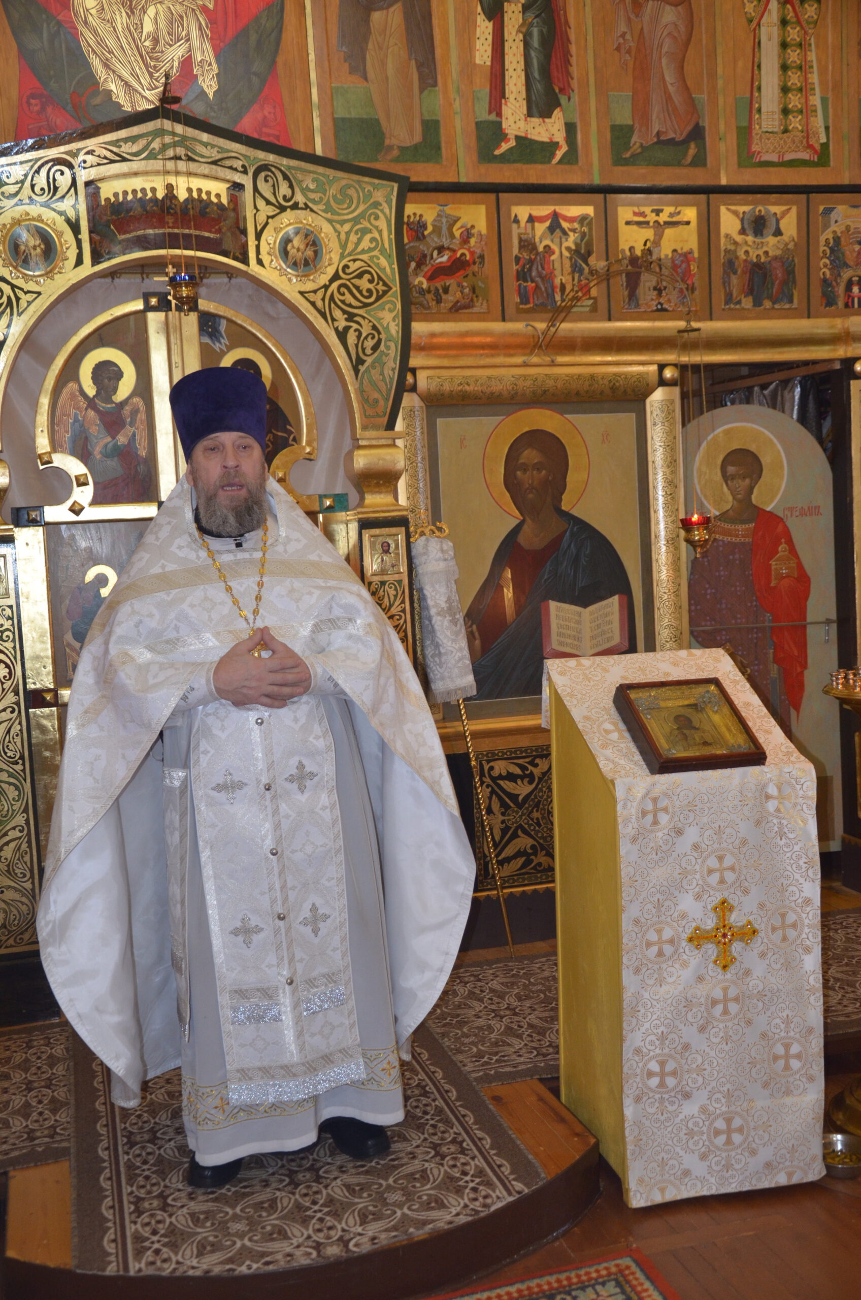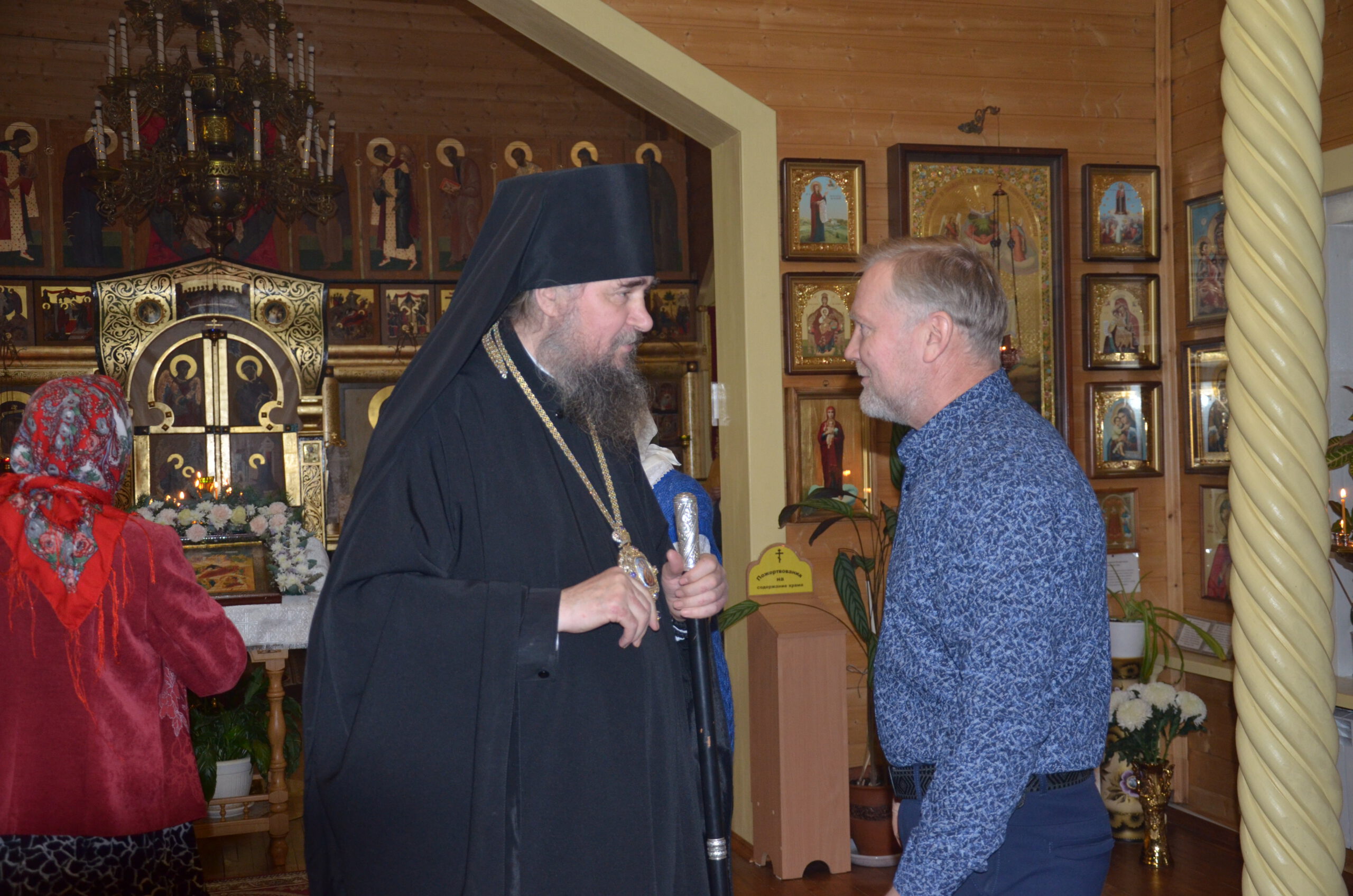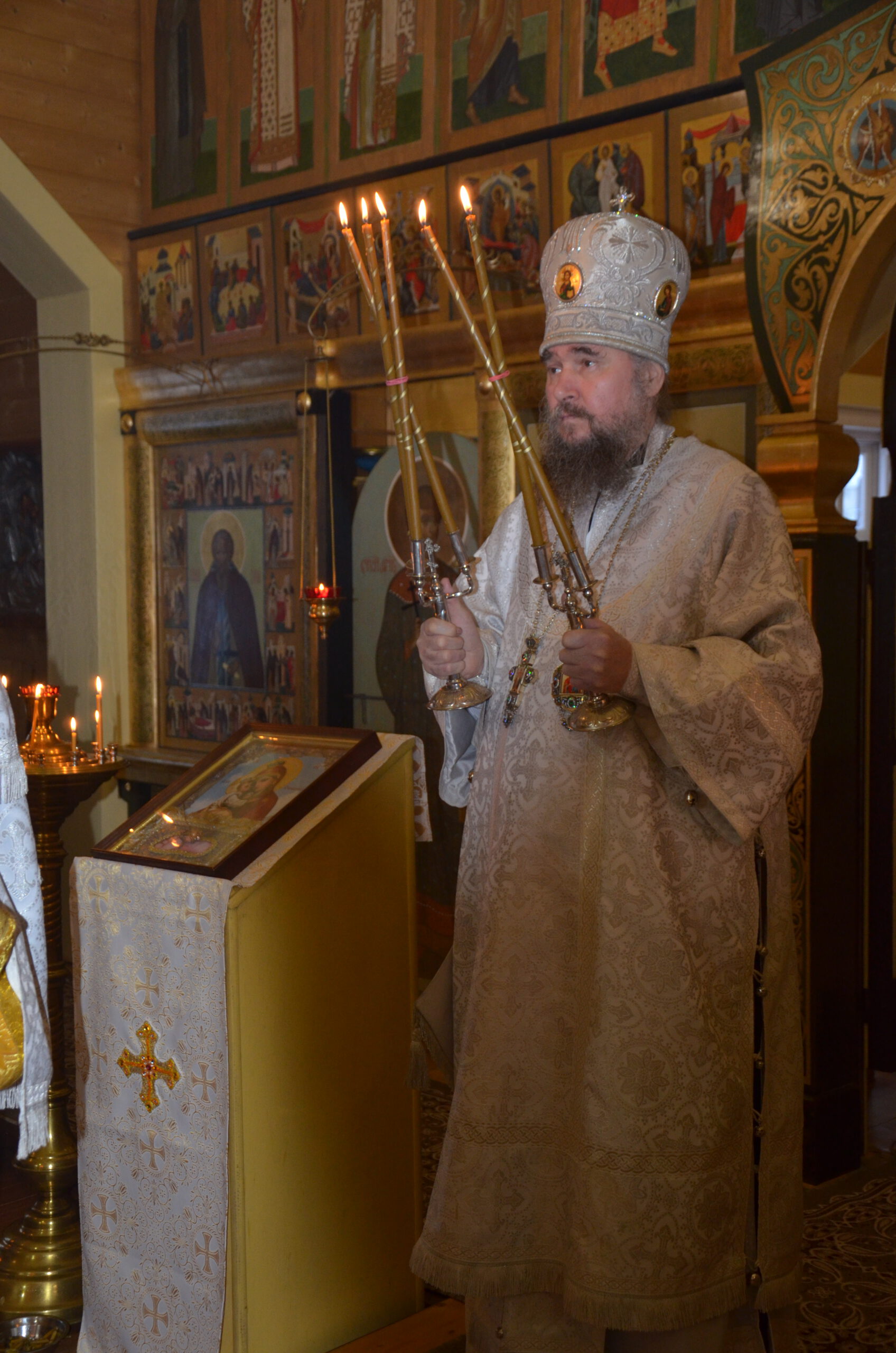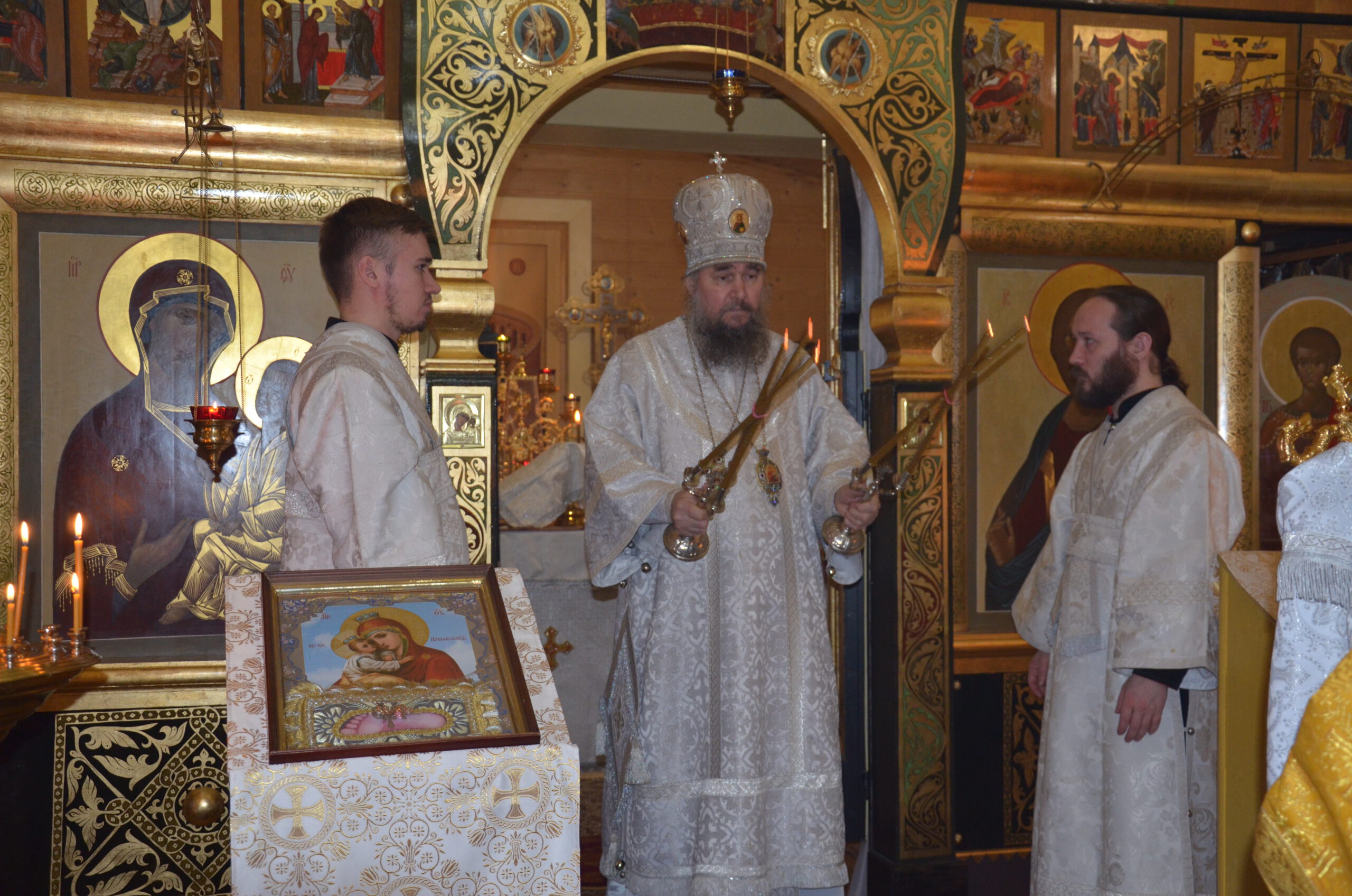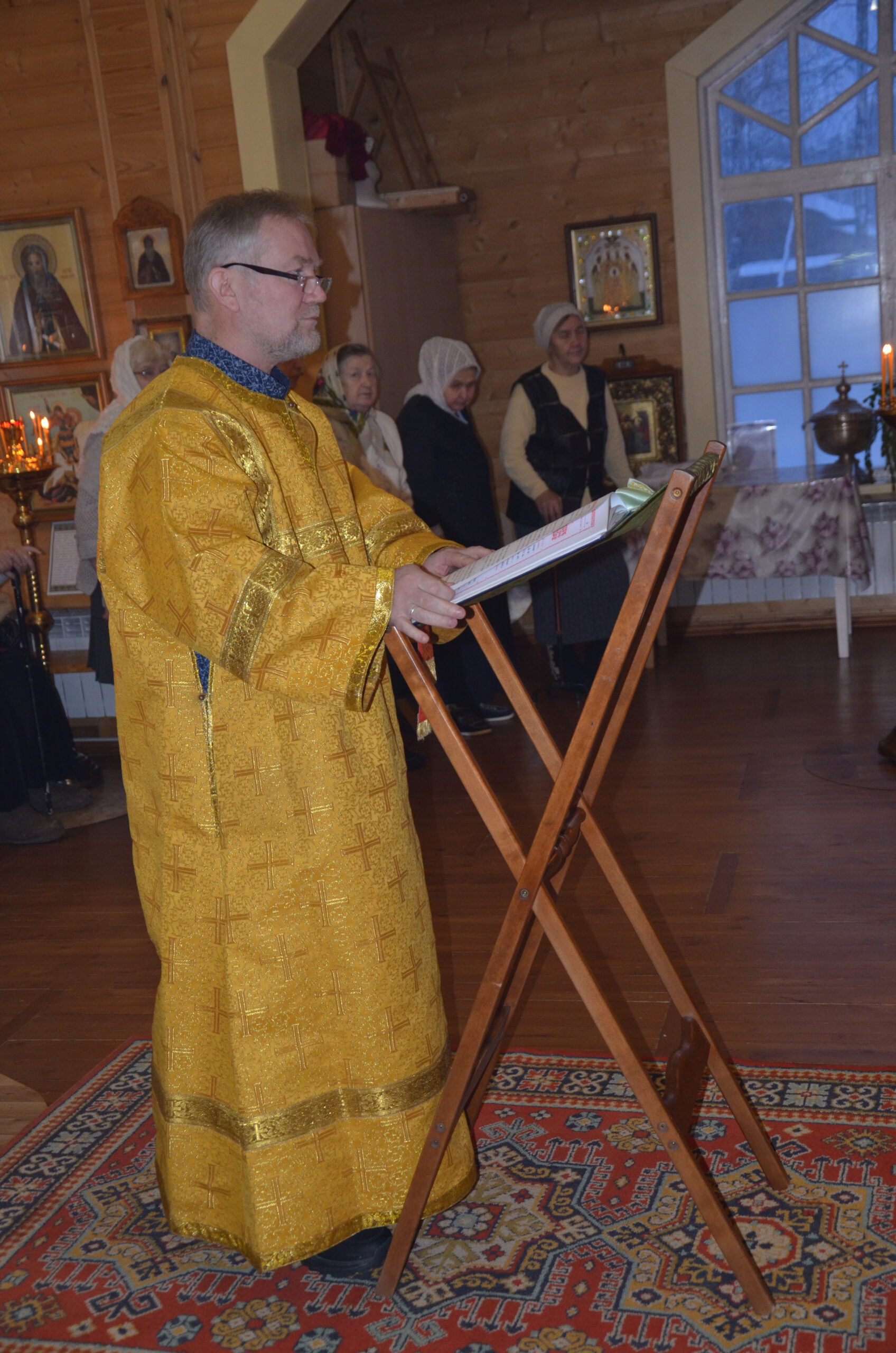 Владыке сослужили: благочинный Тарногского округа протоиерей Николай Кручёных, настоятель храма Агапита Маркушевского в Нюксенице иерей Максим Кривошанов , настоятель храма Богоявления Господня в Городишне иерей Александр Чудинов.