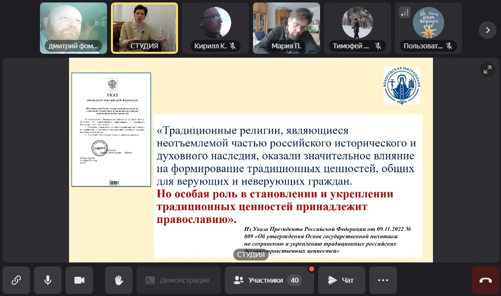 6 марта состоялся организованный Вологодской митрополией вебинар на тему «Организационные и содержательные вопросы участия представителей Вологодской митрополии в родительских собраниях по выбору курса модуля «Основы религиозных культур и светской этики». На вебинаре речь шла о возможном участии священников в работе родительских собраний. Великоустюжскую епархию представили епископ Великоустюжский и Тотемский Фотий, и также благочинный Устюжского округа протоиерей Дмитрий Фомин.