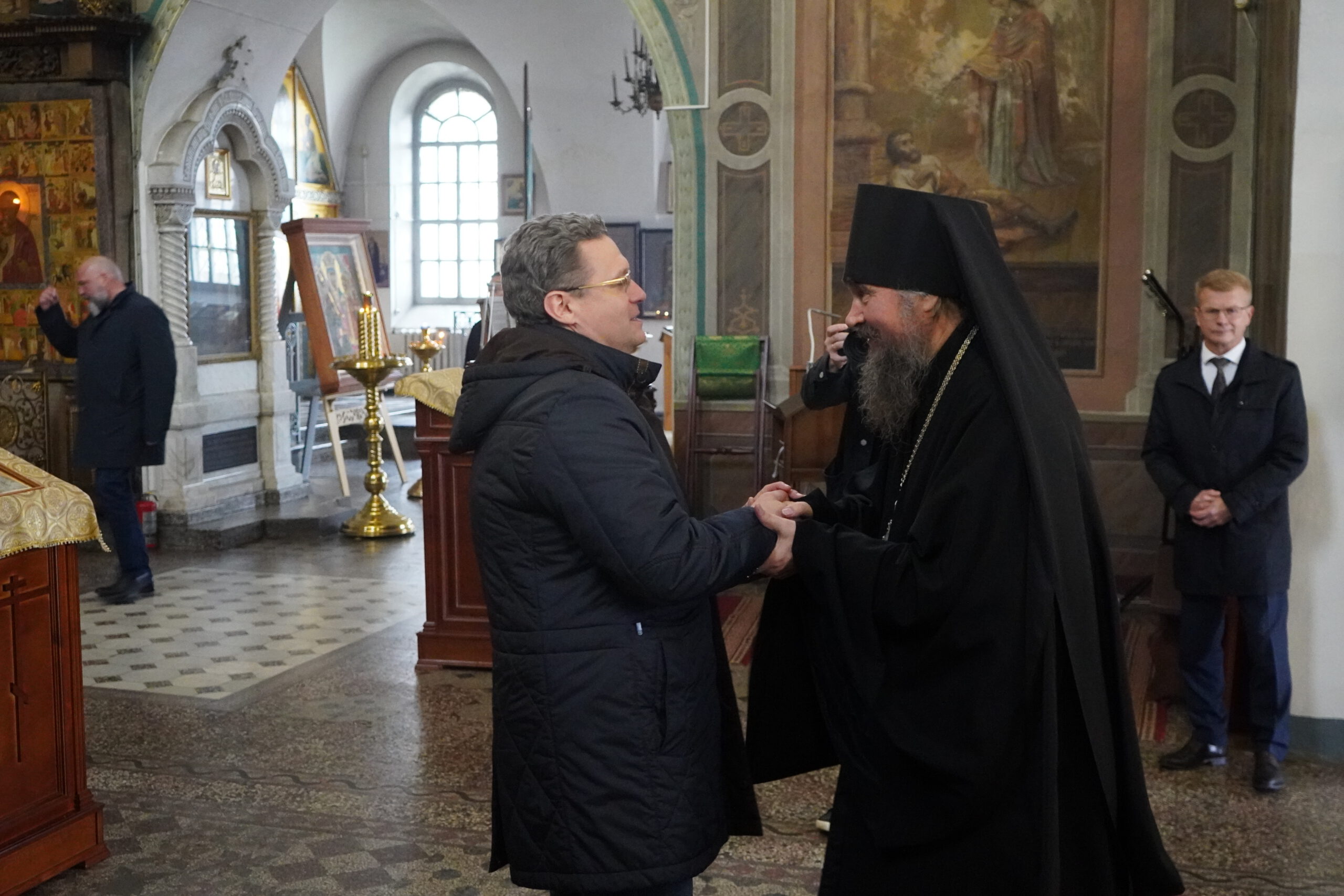 В пятницу 19 сентября Великий Устюг посетил губернатор Вологодской области Георгий Филимонов и сотрудники областной администрации. Глава региона провёл встречу с представителями местных властей по подготовке Великого Устюга к празднованию 880-летнего юбилея города. В завершение визита Георгий Юрьевич посетил Прокопьевский собор, который сейчас готовится к проведению масштабных реставрационных работ. В Кафедральном соборе губернатор помолился, а затем встретился и побеседовал с епископом Великоустюжским и Тотемским Фотием. В день Архистратига Михаила владыка Фотий преподнёс главе региона образ архангела.