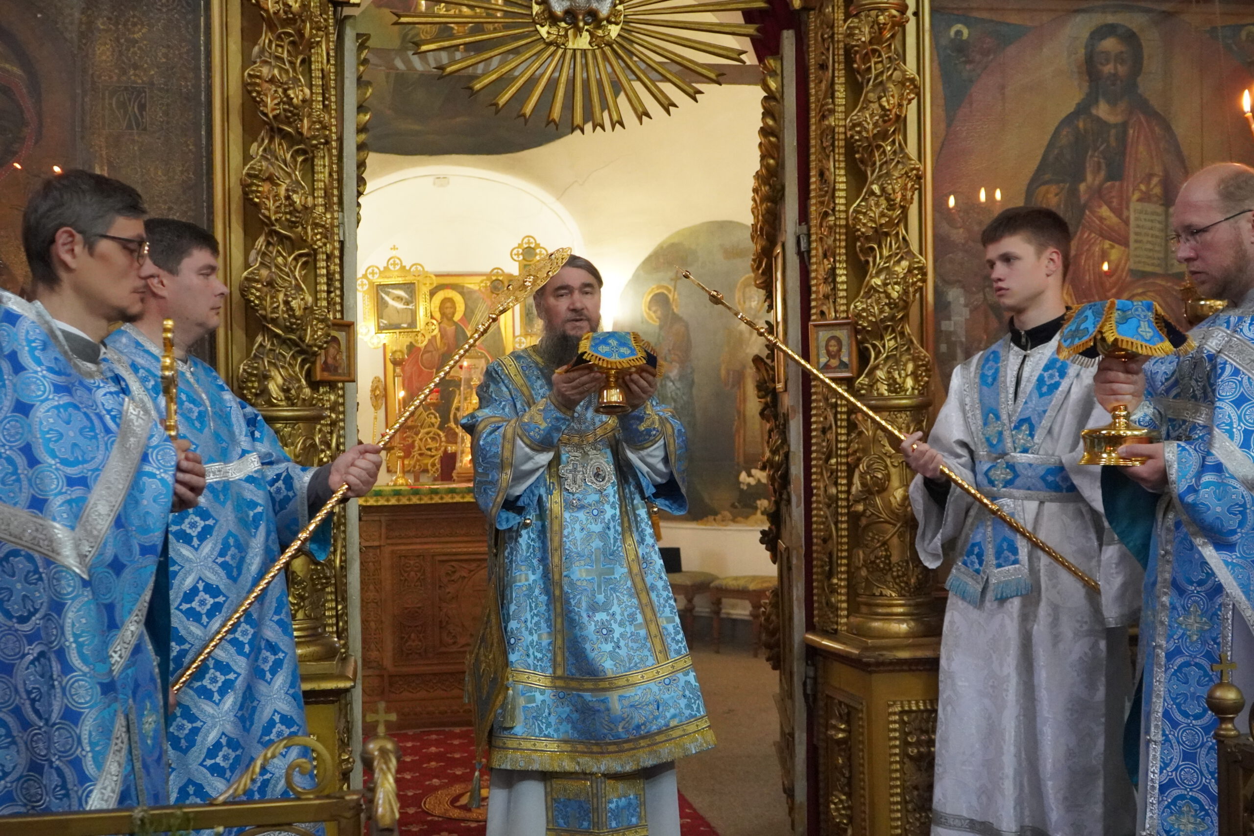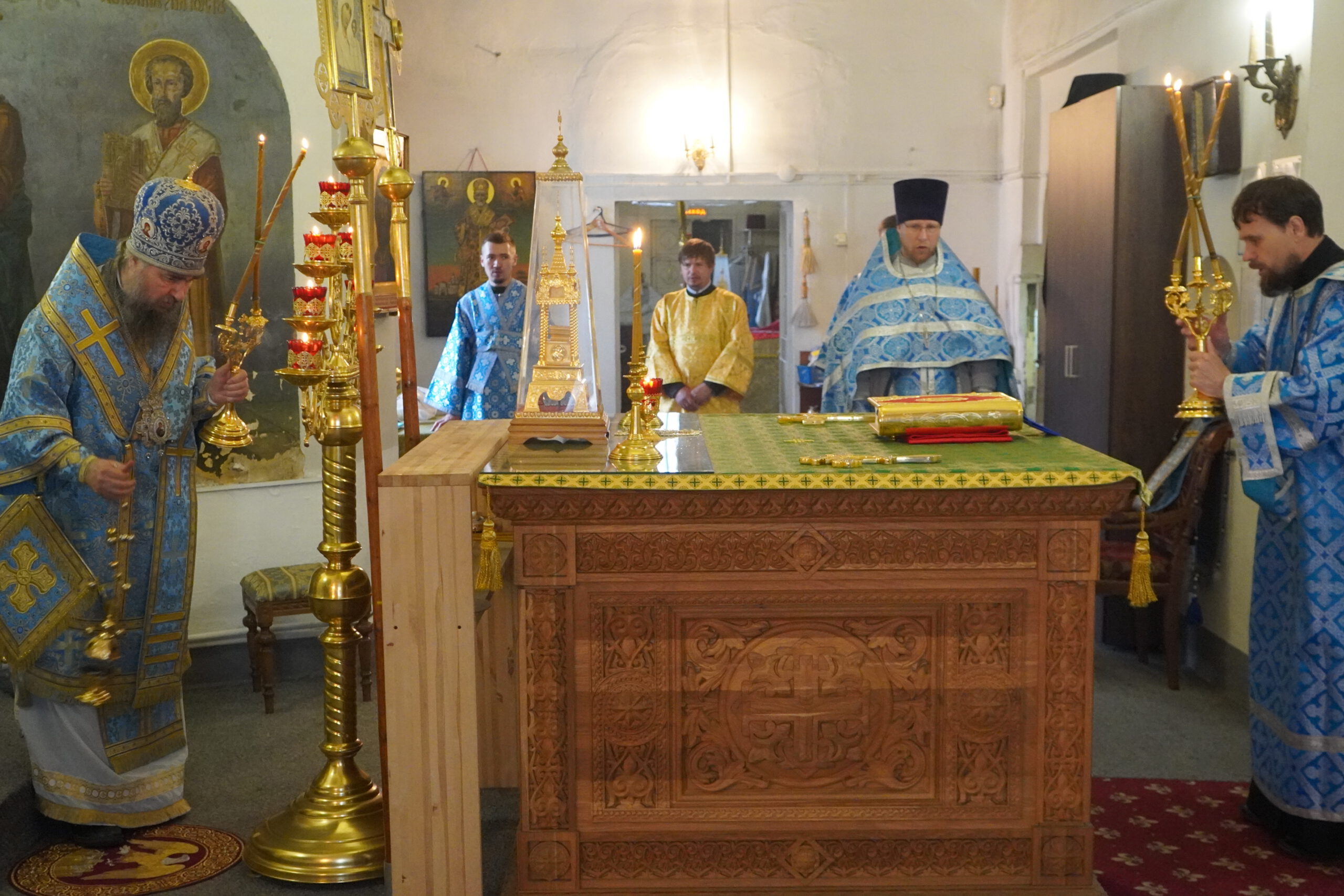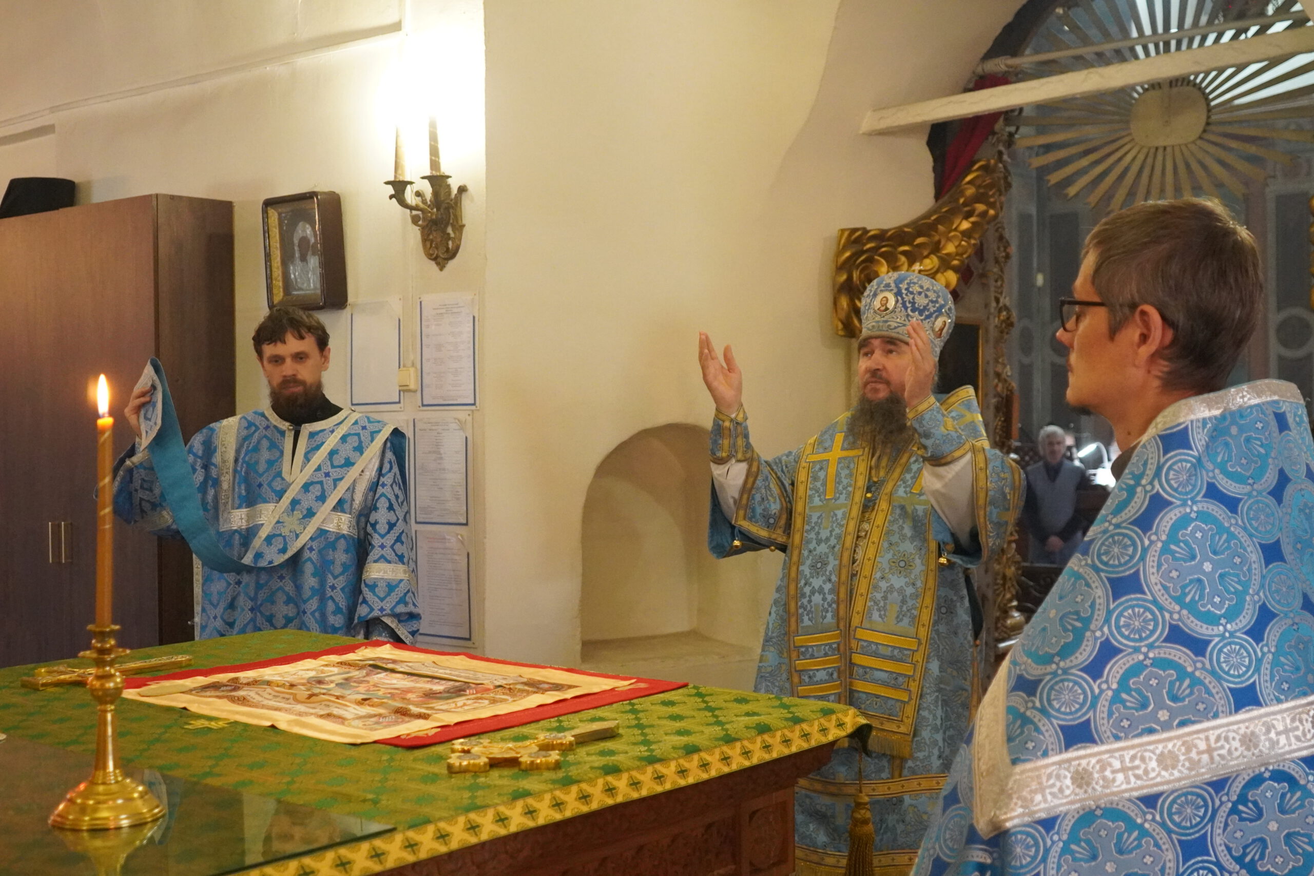 Владыке сослужили: клирик Прокопьевского собора иерей Андрей Игнатьев, настоятель храма Александра Невского в Кичменгском Городке иерей Олег Викторов, а также диакон Иван Холодилов.