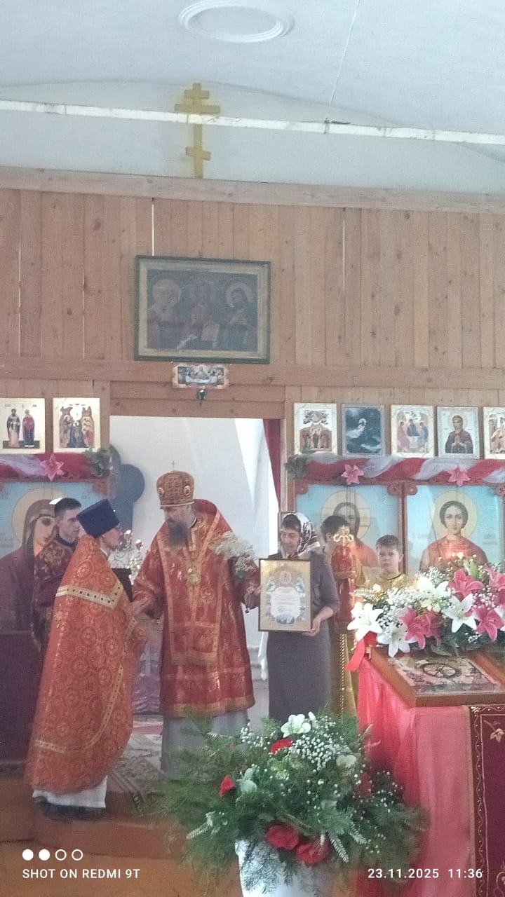 Святой Георгий пострадал в четвёртом веке в Малой Азии во времена гонений императора Диоклетиана на христиан. Он очень полюбился русскому народу, как покровитель воинов. Неслучайно Георгий, пронзающий змея изображён на гербе города Москвы, столицы нашего государства. Замечательно, что в такой глубинке тоже когда-то местные жители пожелали, чтобы храм был освящён в честь святого Георгия Победоносца. Я уверен, что вы с любовью посещаете этот храм, молитесь Георгию Победоносцу, и чувствуете его поддержку. Когда мы ко святым обращаемся, они нам помогают в жизни. Очень рад вас приветствовать, поздравляю всех с праздником, желаю, чтобы великомученик Георгий Победоносец оберегал и помогал нам во все дни нашей жизни. Аминь!»