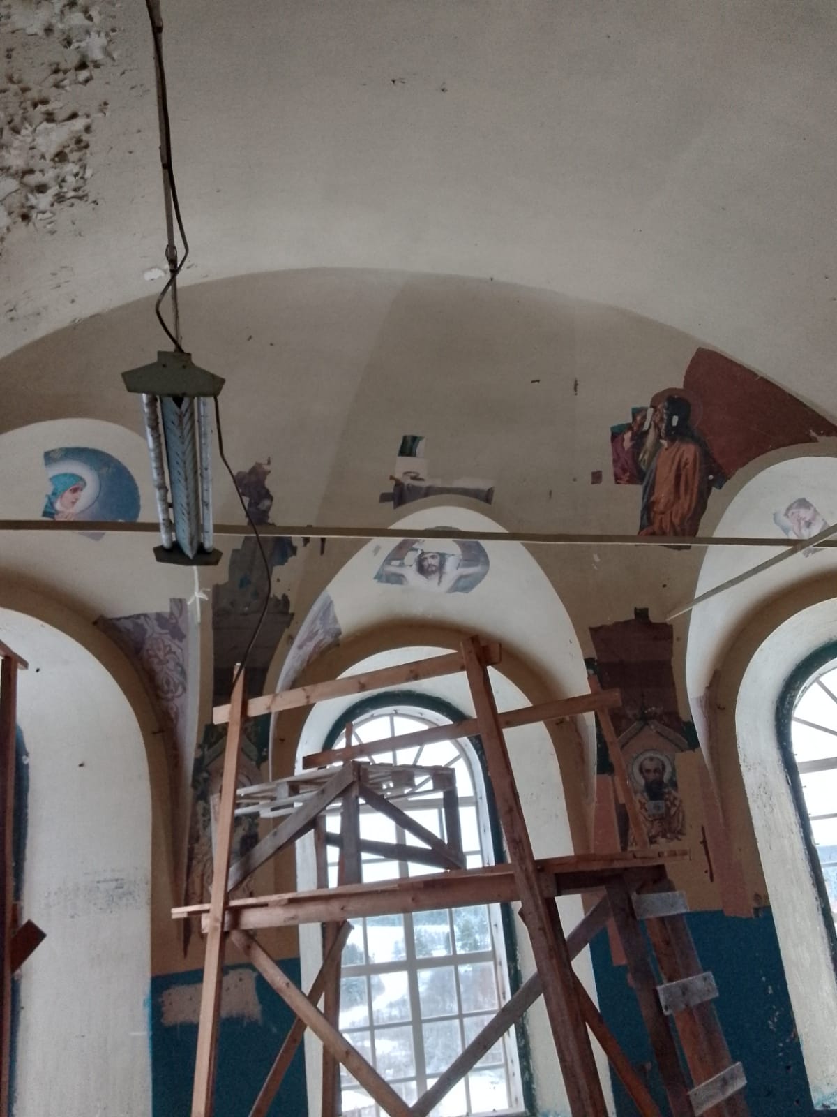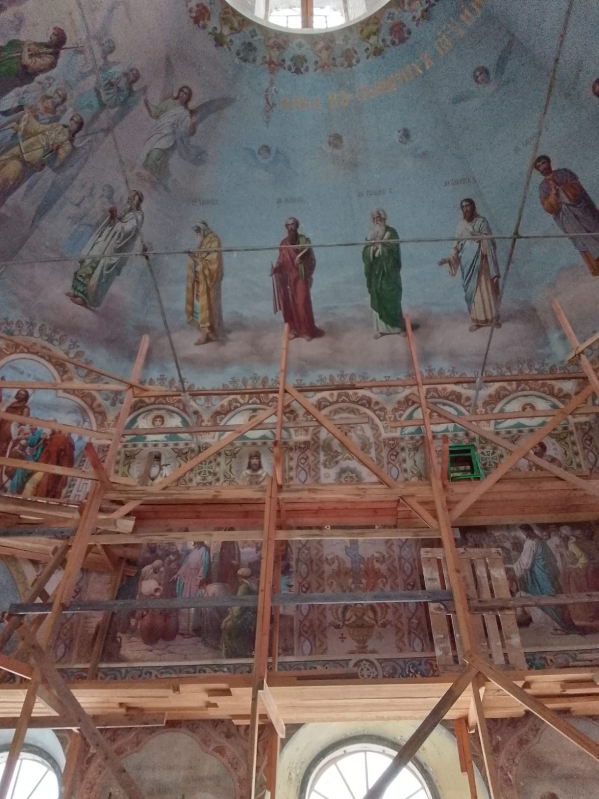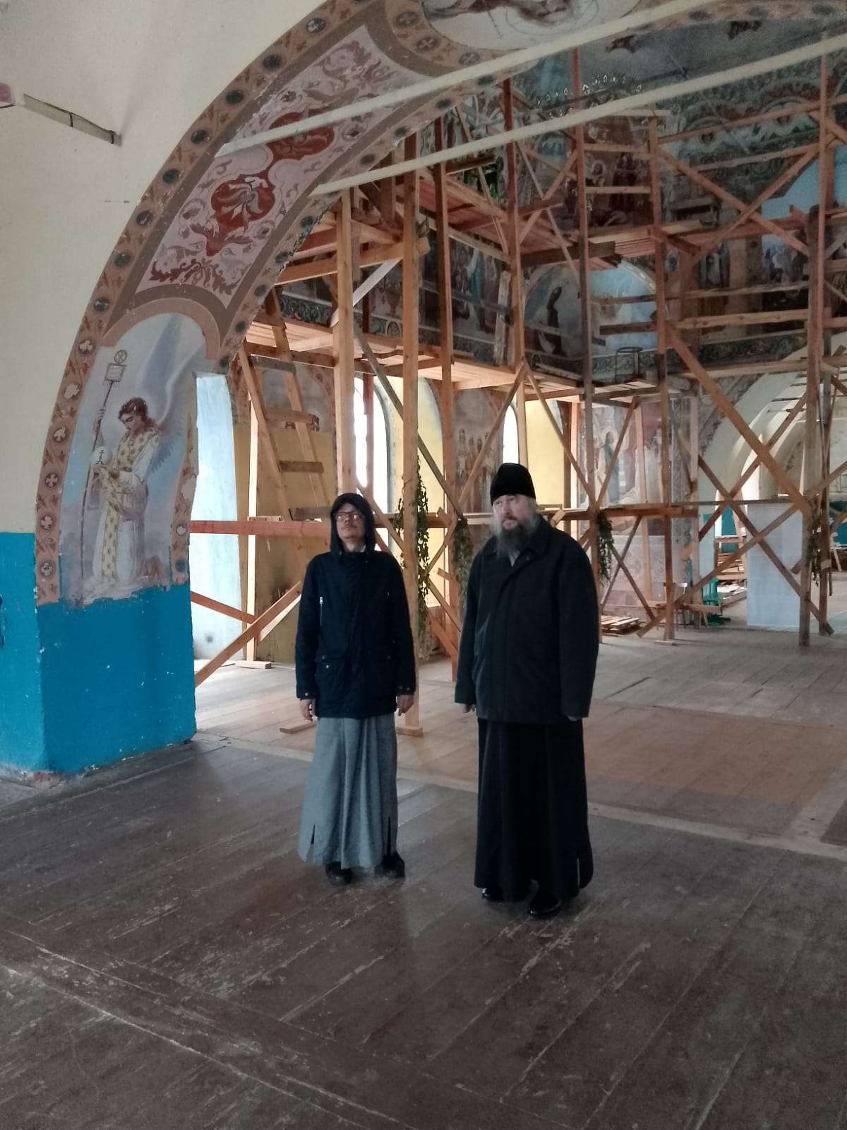 За Литургией Преосвященный Фотий произнёс проповедь, а также осмотрел помещения верхнего холодного храма, украшенные фресками устюжского иконописца Пантелеймона Яковлевича Кострова.