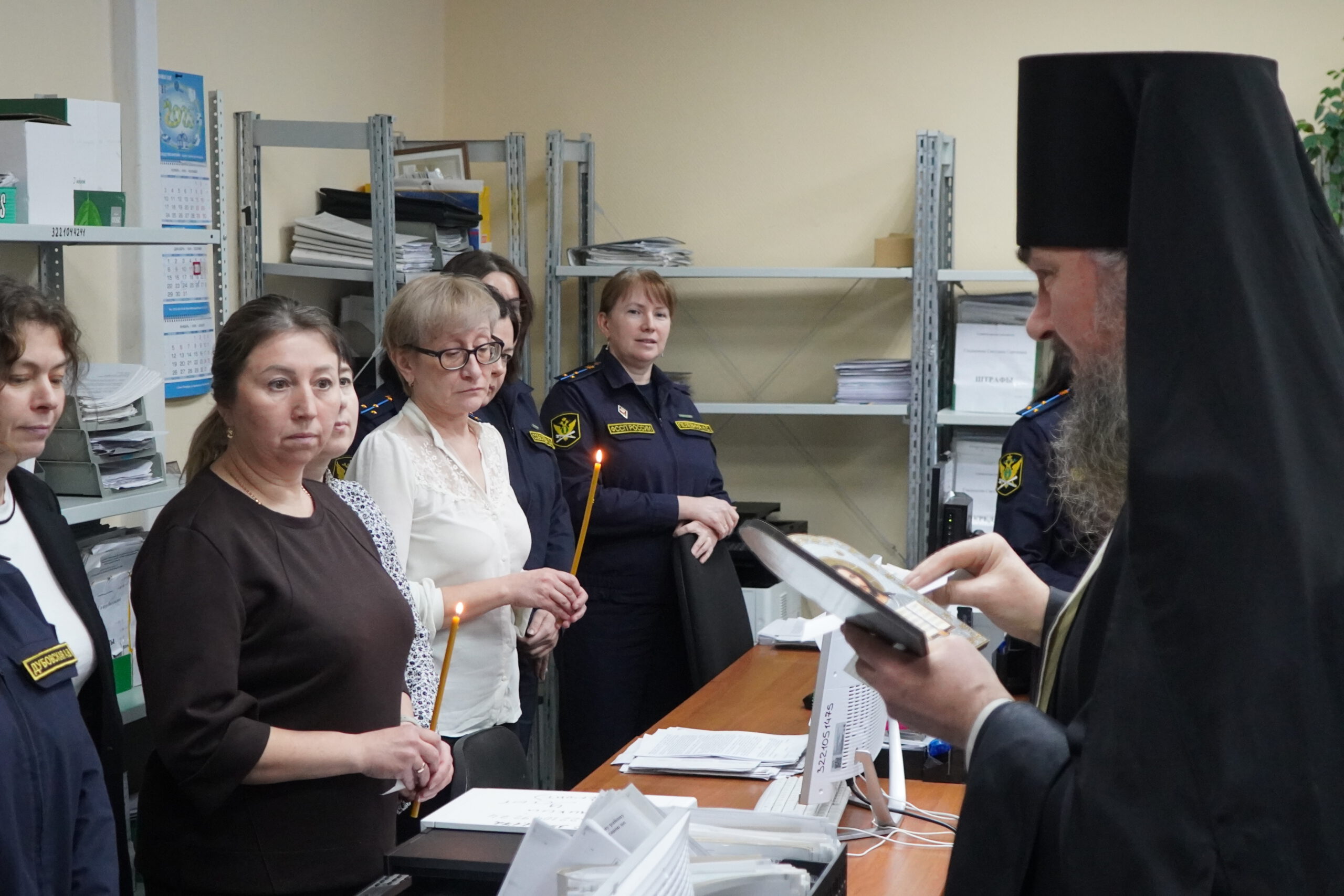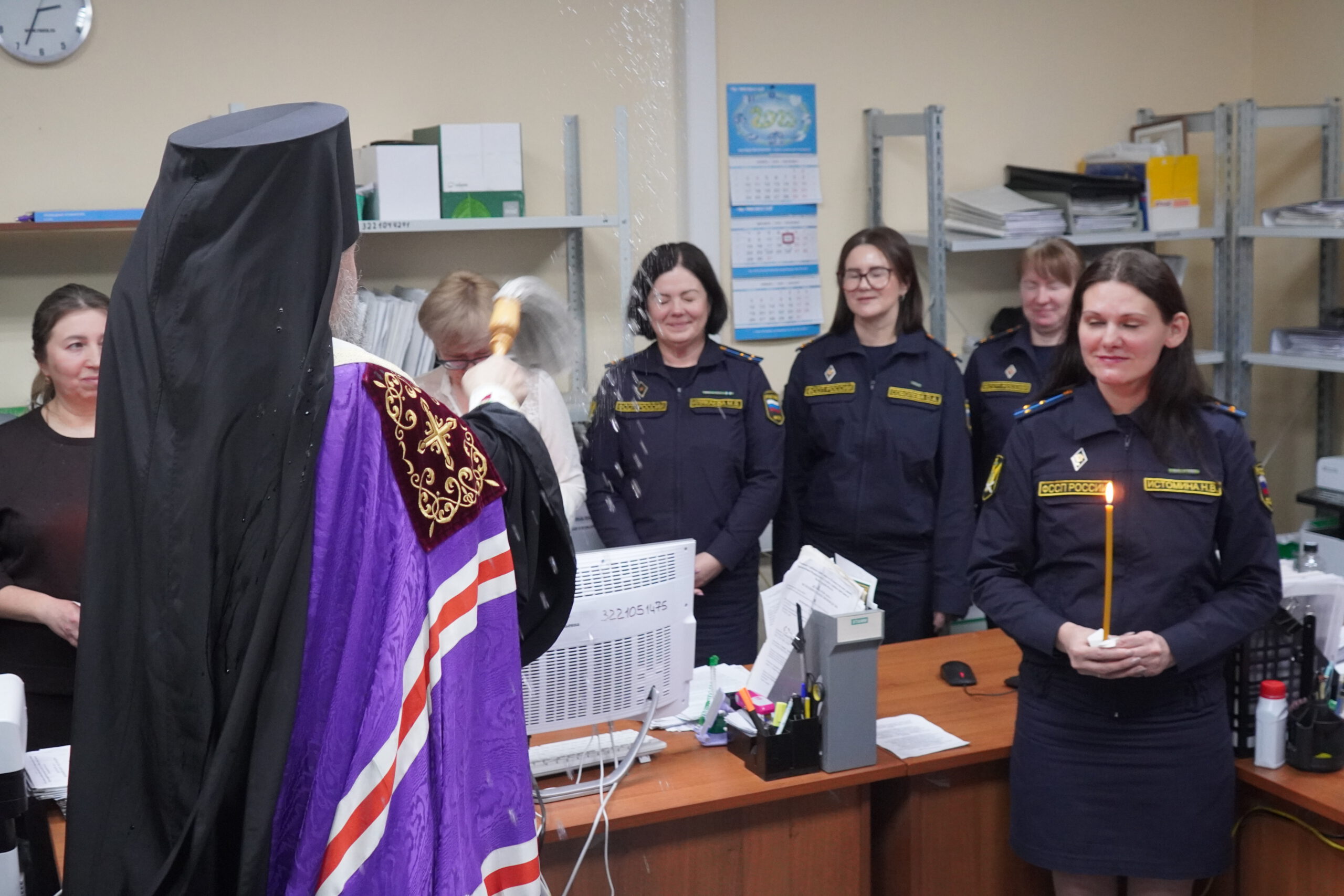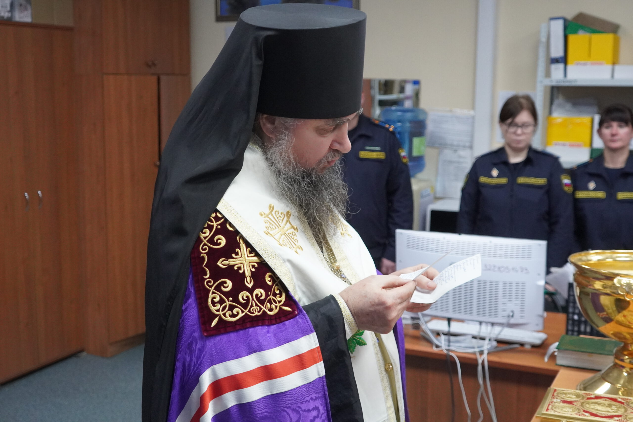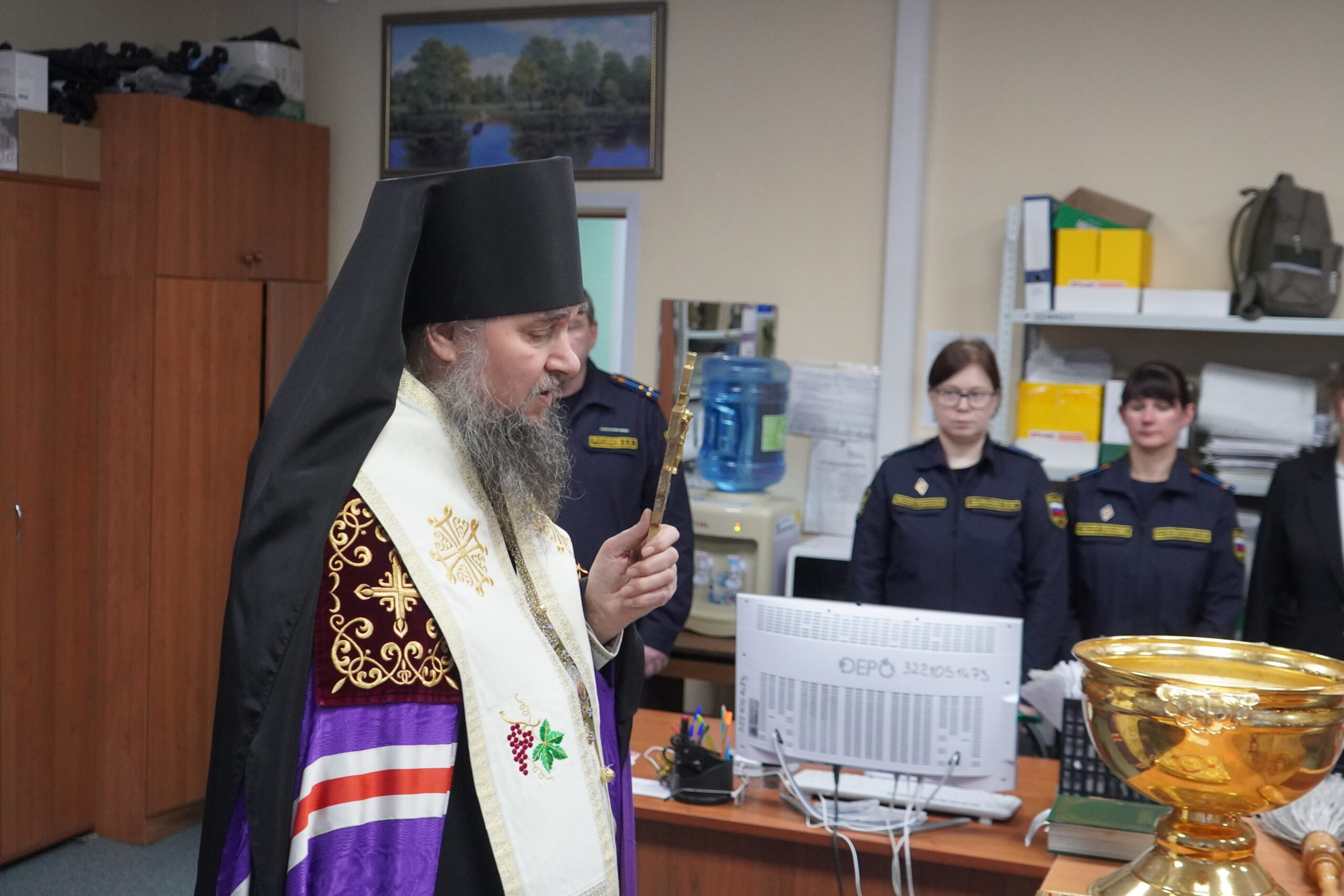 В минувшую пятницу 12 декабря епископ Великоустюжский и Тотемский Фотий посетил судебных приставов Великого Устюга. В здании, где они размещаются недавно завершился ремонт и руководство учреждения приняло решение освятить помещения. Владыка побеседовал с приставами, после чего совершил молебен и окропил святою водою все помещения здания службы приставов, а также подарил образ Христа и Богоматери. После молебна состоялась встреча архиерея с Ириной Александровной Салминой — главным судебным приставом Вологодской области и начальником устюгского отделения Игорем Александровичем Гладышевым, где собравшиеся обсудили возможности сотрудничества епархии и службы судебных приставов.