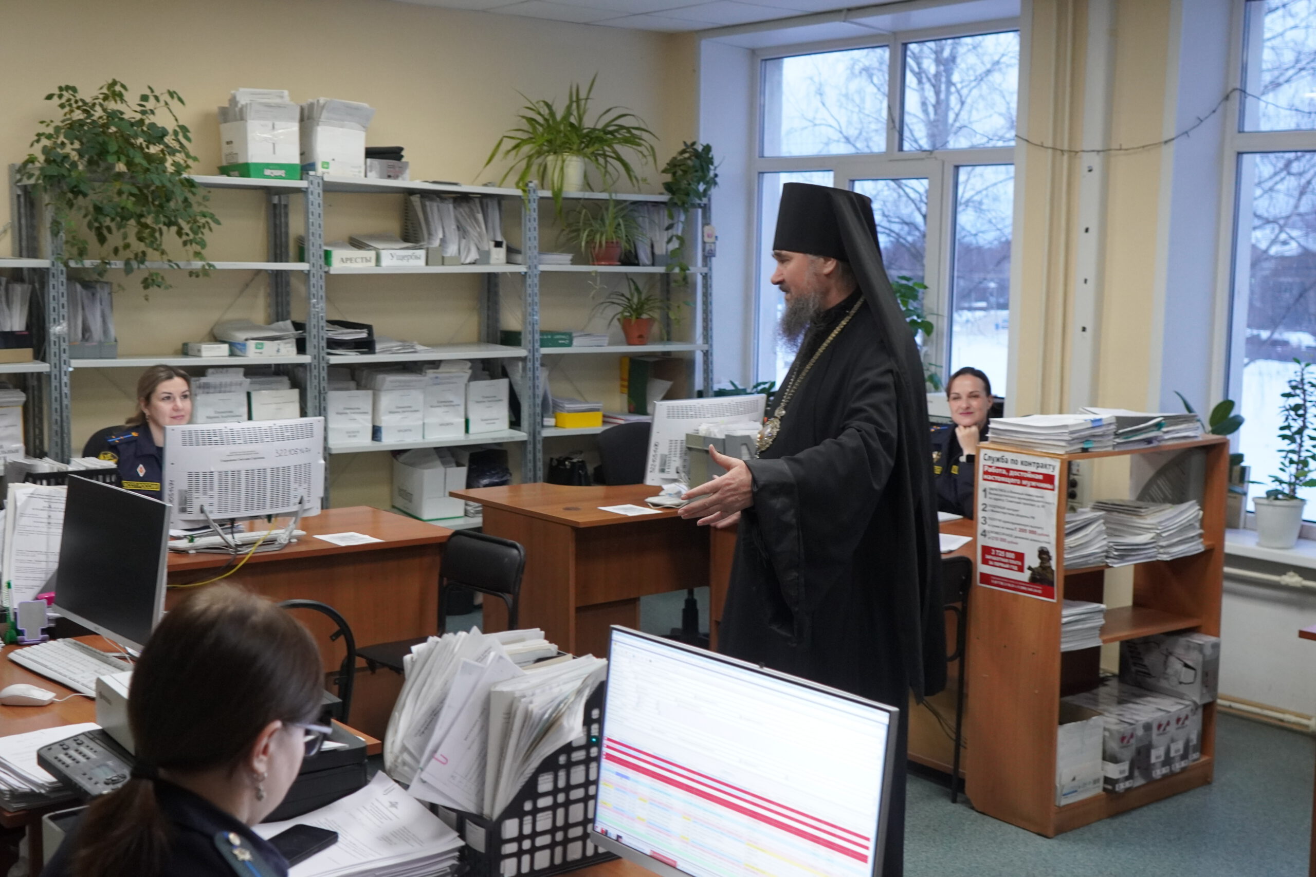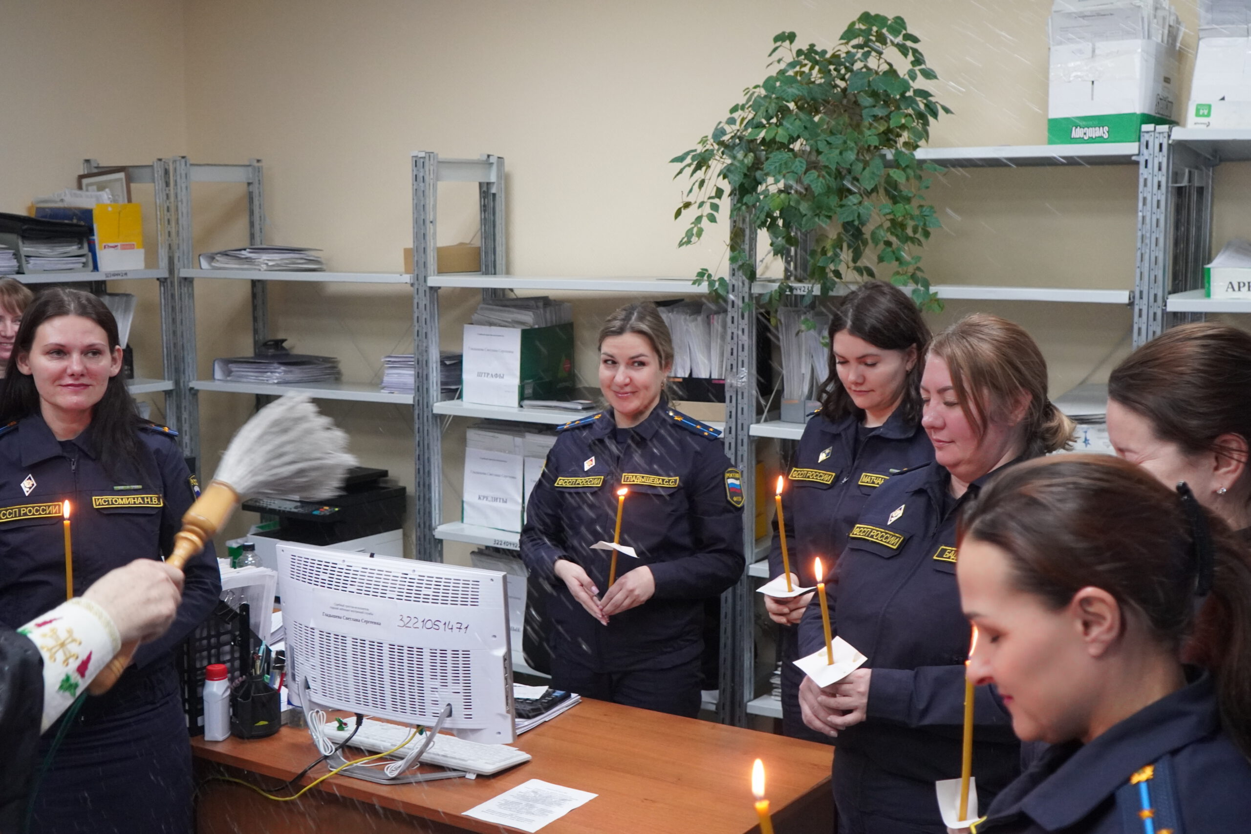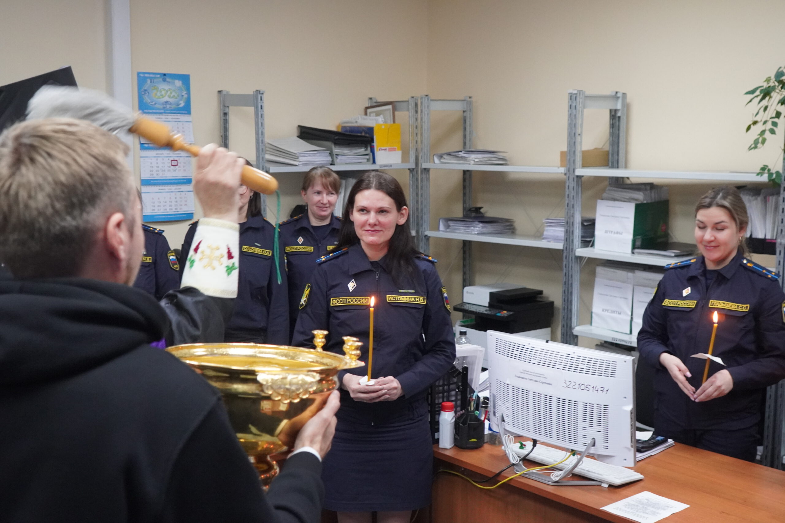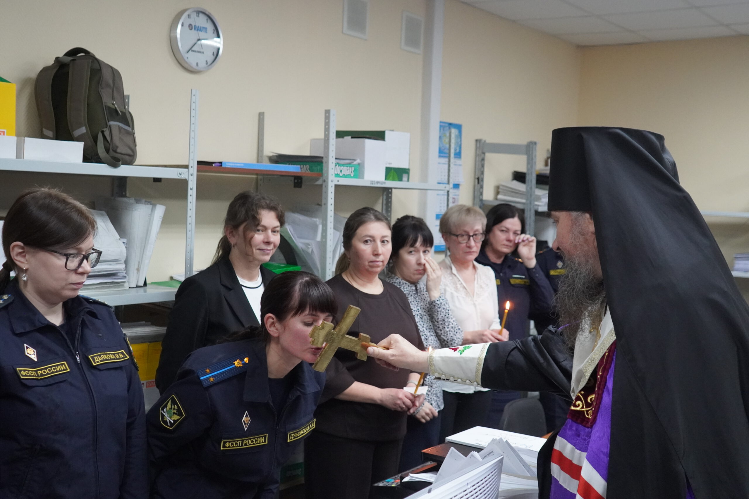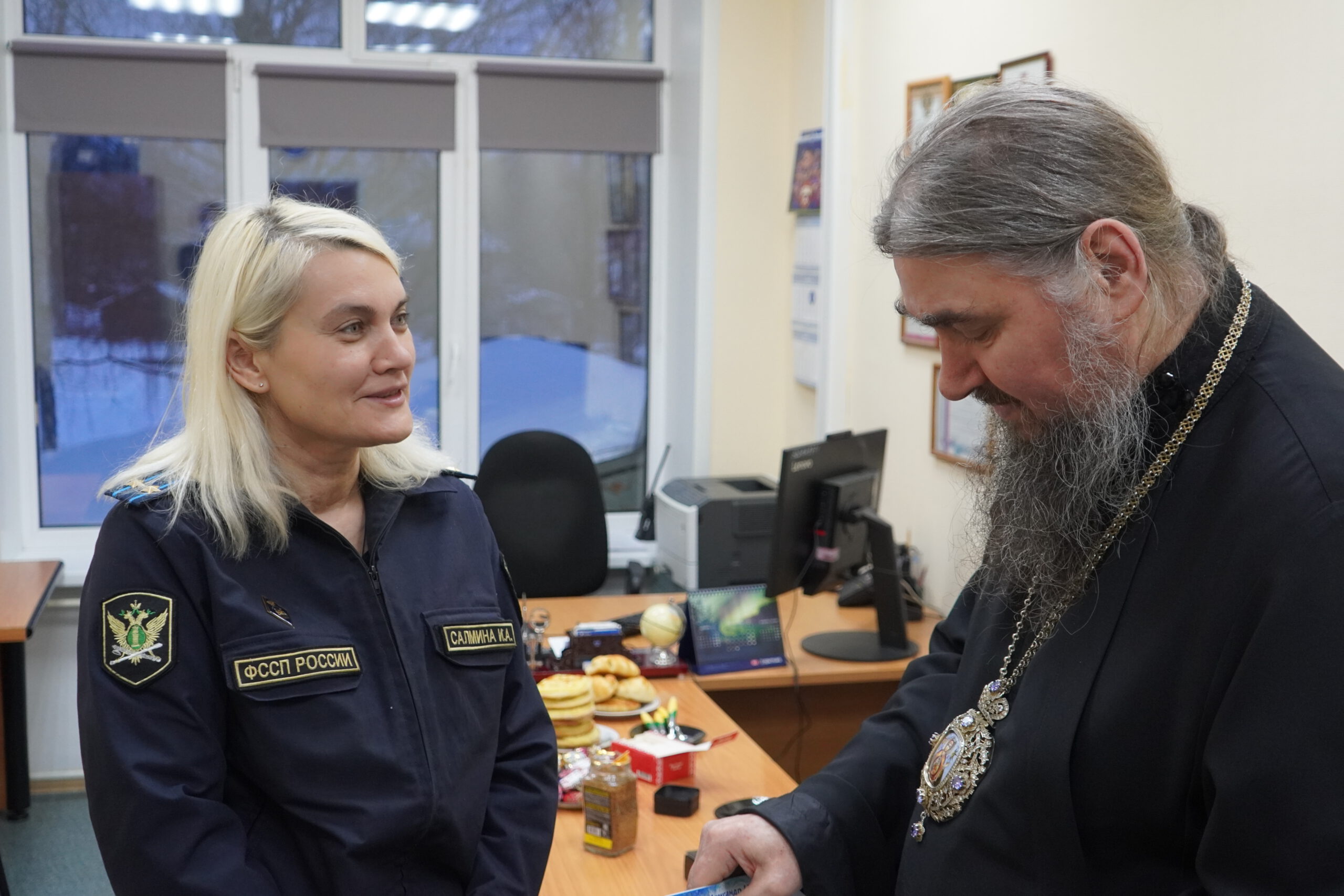 В минувшую пятницу 12 декабря епископ Великоустюжский и Тотемский Фотий посетил судебных приставов Великого Устюга. В здании, где они размещаются недавно завершился ремонт и руководство учреждения приняло решение освятить помещения. Владыка побеседовал с приставами, после чего совершил молебен и окропил святою водою все помещения здания службы приставов, а также подарил образ Христа и Богоматери. После молебна состоялась встреча архиерея с Ириной Александровной Салминой — главным судебным приставом Вологодской области и начальником устюгского отделения Игорем Александровичем Гладышевым, где собравшиеся обсудили возможности сотрудничества епархии и службы судебных приставов.