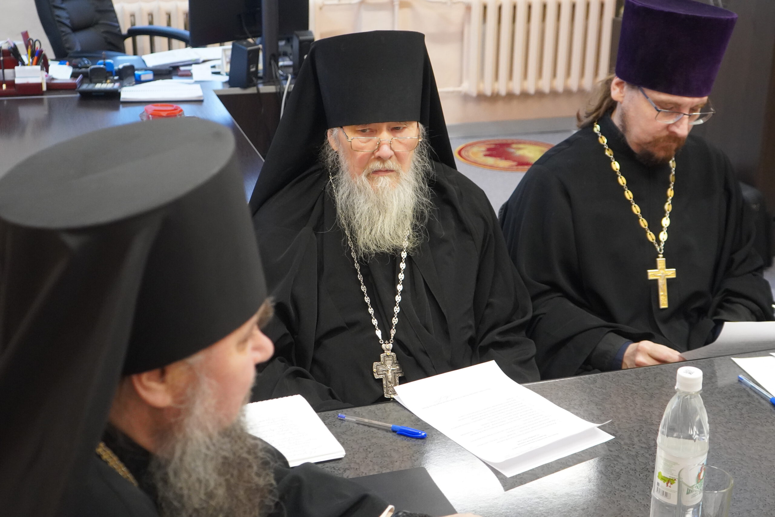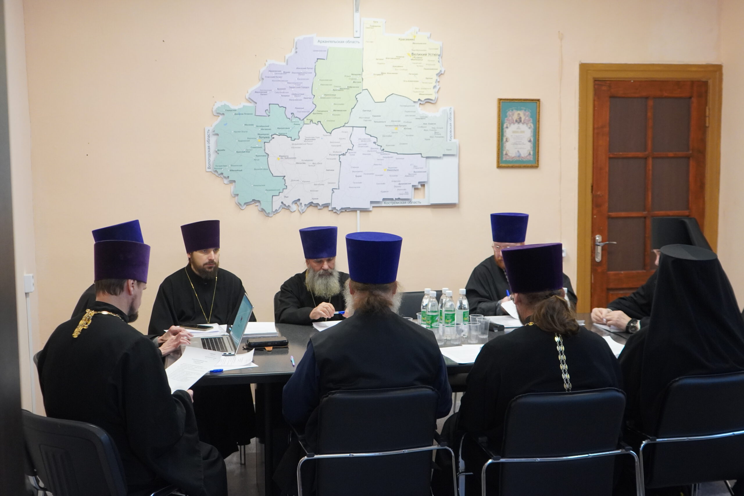 На заседании Епархиального Совета присутствовали настоятель Архиерейского подворья Михайло-Архангельский монастырь иеромонах Иоаким (Угдужеков); благочинный Великоустюжского церковного округа, настоятель Архиерейского подворья храма святителя Стефана Великопермского протоиерей Димитрий Фомин; настоятель прихода храма Рождества Христова г. Тотьмы протоиерей Георгий Титов; благочинный Тарногского церковного округа, настоятель прихода храма святителя Николая Чудотворца с. Тарногский Городок протоиерей Николай Крученых; руководитель отдела по культуре Великоустюжской Епархии, настоятель храма равноапостольного князя Владимира город Красавино, Великоустюгского района протоиерей Михаил Волков; благочинный Тотемского церковного округа, настоятель прихода храма Вассиана Тиксненского с. Юбилейное, Тотемского района иерей Серафим Розин; благочинный Никольского церковного округа, настоятель прихода храма в честь Казанской иконы Божией Матери иерей Александр Мелков; ключарь кафедрального собора святого праведного Прокопия иерей Вячеслав Бураков; настоятель храма благоверного князя Александра Невского село Кичменгский Городок иерей Олег Викторов.