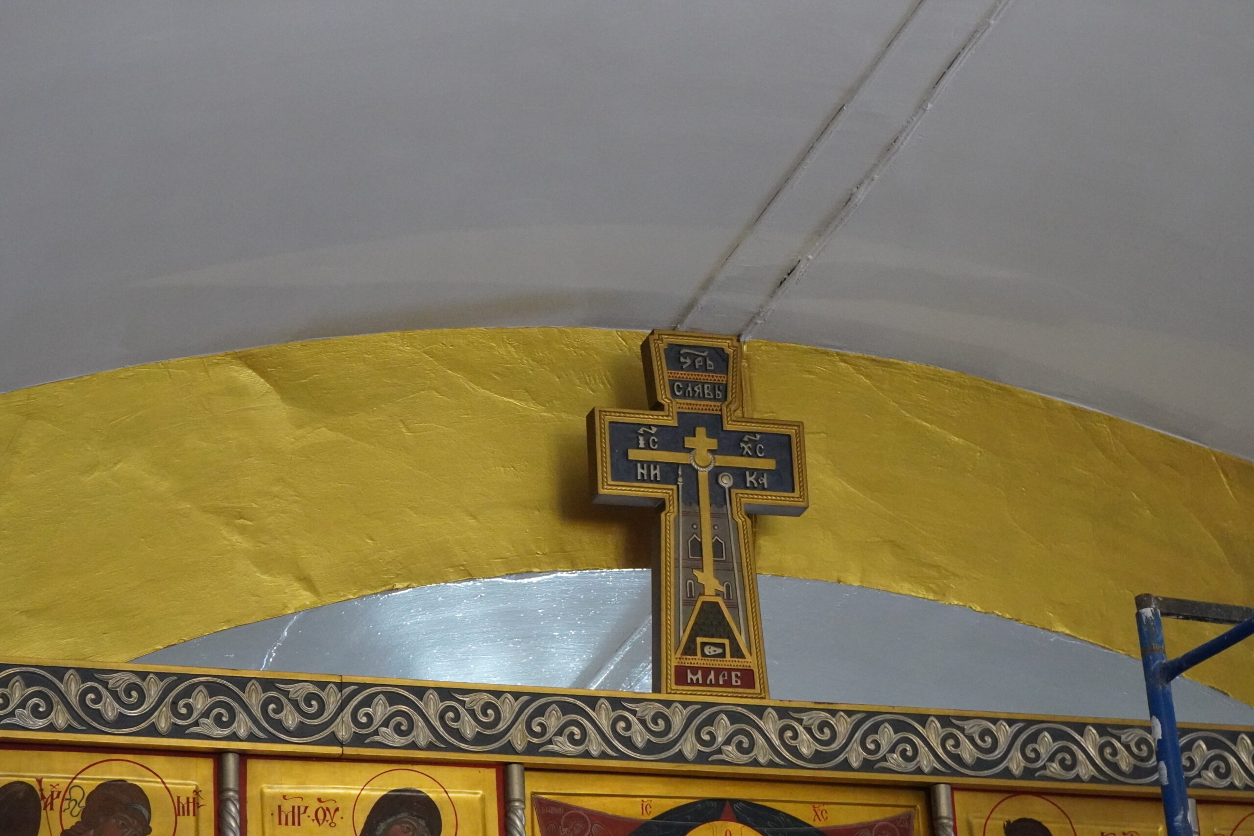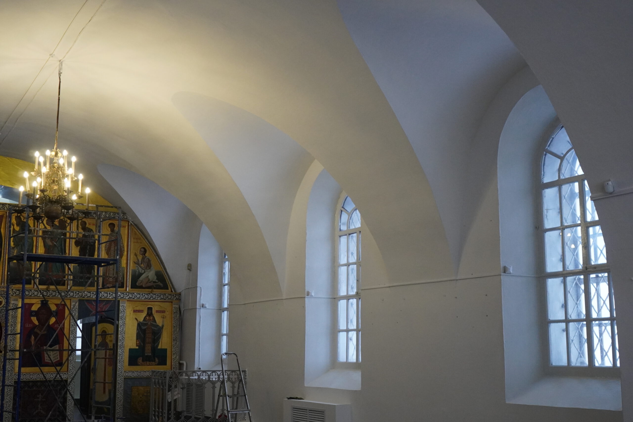 Рабочие бригады Алексея Машутинского расчистили старые слои краски, расчистили, укрепили и зашпатлевали трещины. Так же заново перекрасили все стены и своды, и трубопроводы внутри помещения. Обшиты гипсокартонными коробами отопительные приборы.