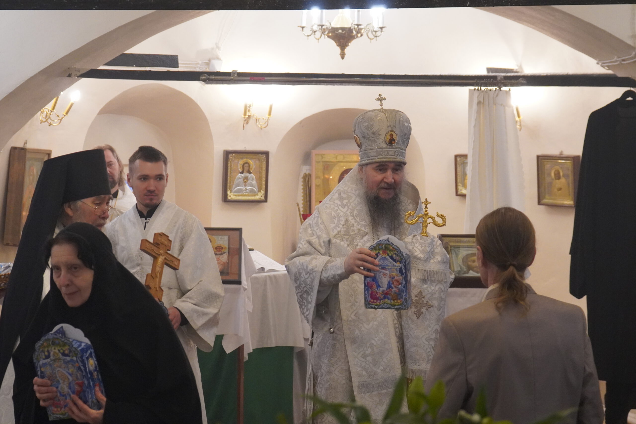 За Литургией Преосвященный Фотий подарил верующим рождественские подарки и произнёс проповедь:
