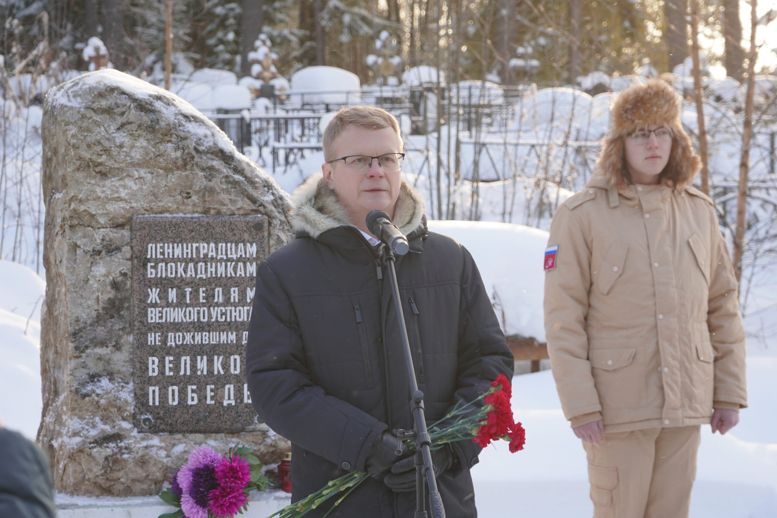 27 января устюжане, вместе со всей страной отмечали 82ю годовщину снятия блокады Ленинграда во время Великой Отечественной Войны. Памятные мероприятия в честь освобождения Ленинграда традиционно проходят на воинском кладбище. Именно здесь расположен монумент в память о ленинградцах, эвакуированных в годы войны в Великий Устюг, и умерших здесь. Вспомнить как город-герой сражался за свою свободу и почтить память погибших в блокаду, и устюжан, сражавшихся за освобождение Ленинграда, собрались представители окружной администрации, общественники и участники молодёжных организаций. Великоустюжскую епархию представил епископ Великоустюжский и Тотемский Фотий. Архиерей произнёс речь и возложил цветы к памятнику блокадникам.