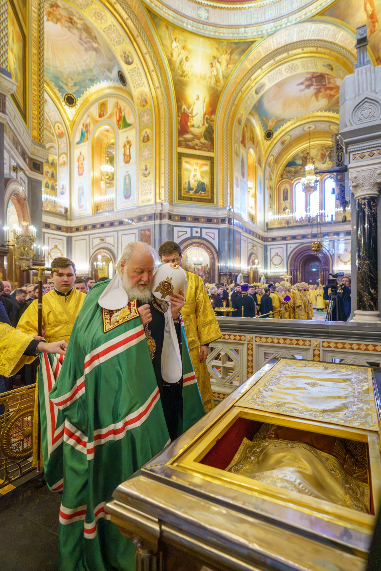 По прибытии в храм перед началом богослужения Патриарх Кирилл поклонился мощам святителя Филарета, митрополита Московского.