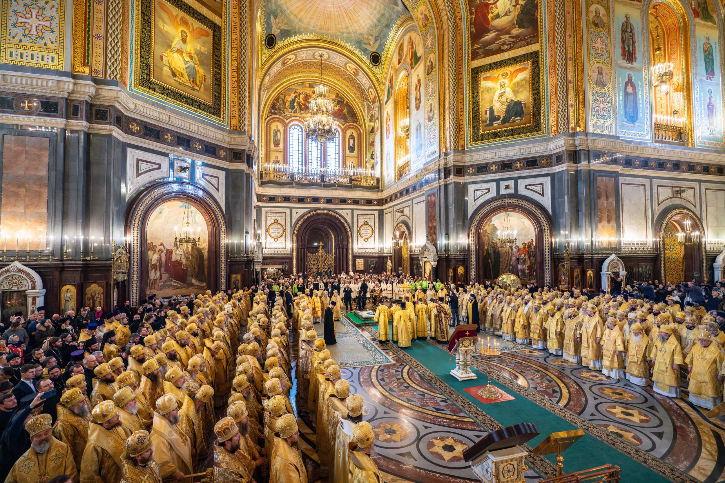 В этот знаменательный день Святейший Патриарх Кирилл совершил Божественную литургию в кафедральном соборном Храме Христа Спасителя в Москве в интронизационных облачениях и с копией жезла святителя Петра.