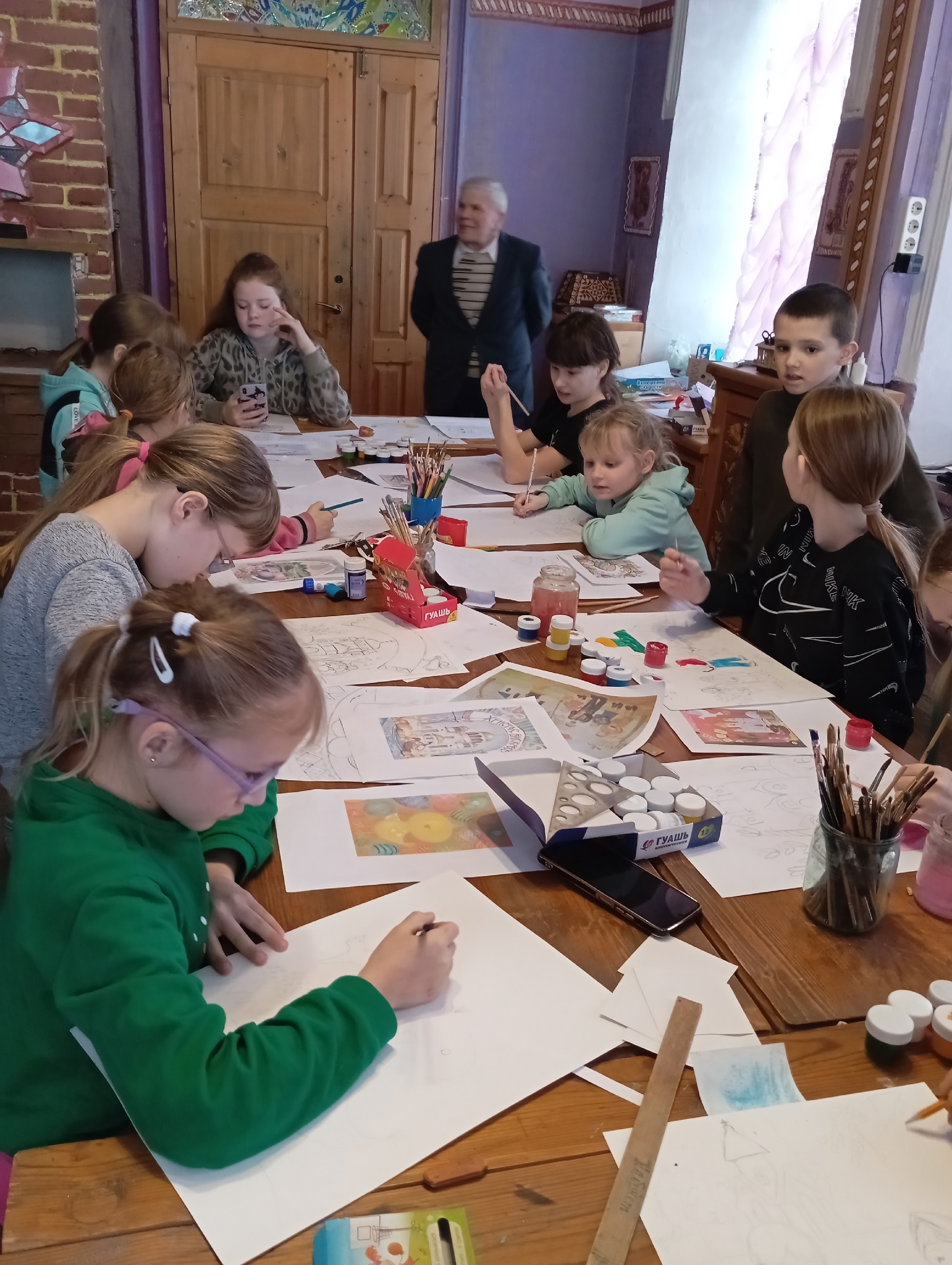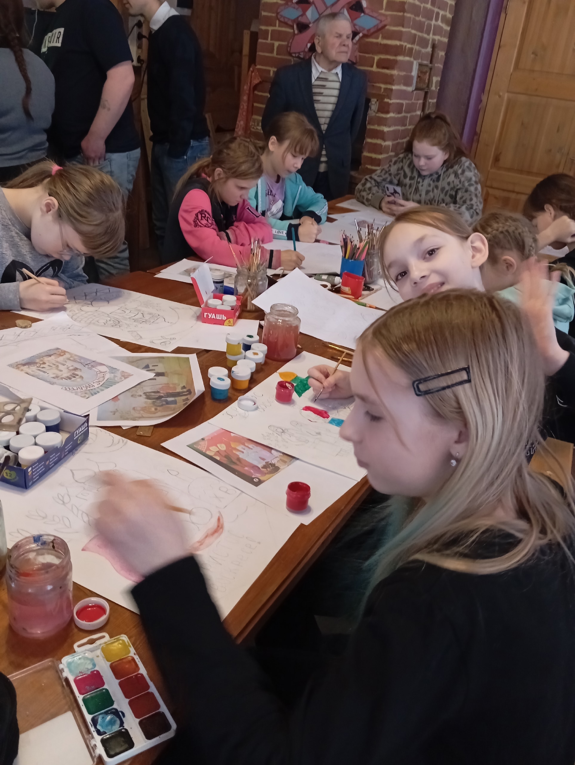 В этот раз ребята готовят рисунки на епархиальную Пасхальную выставку .
