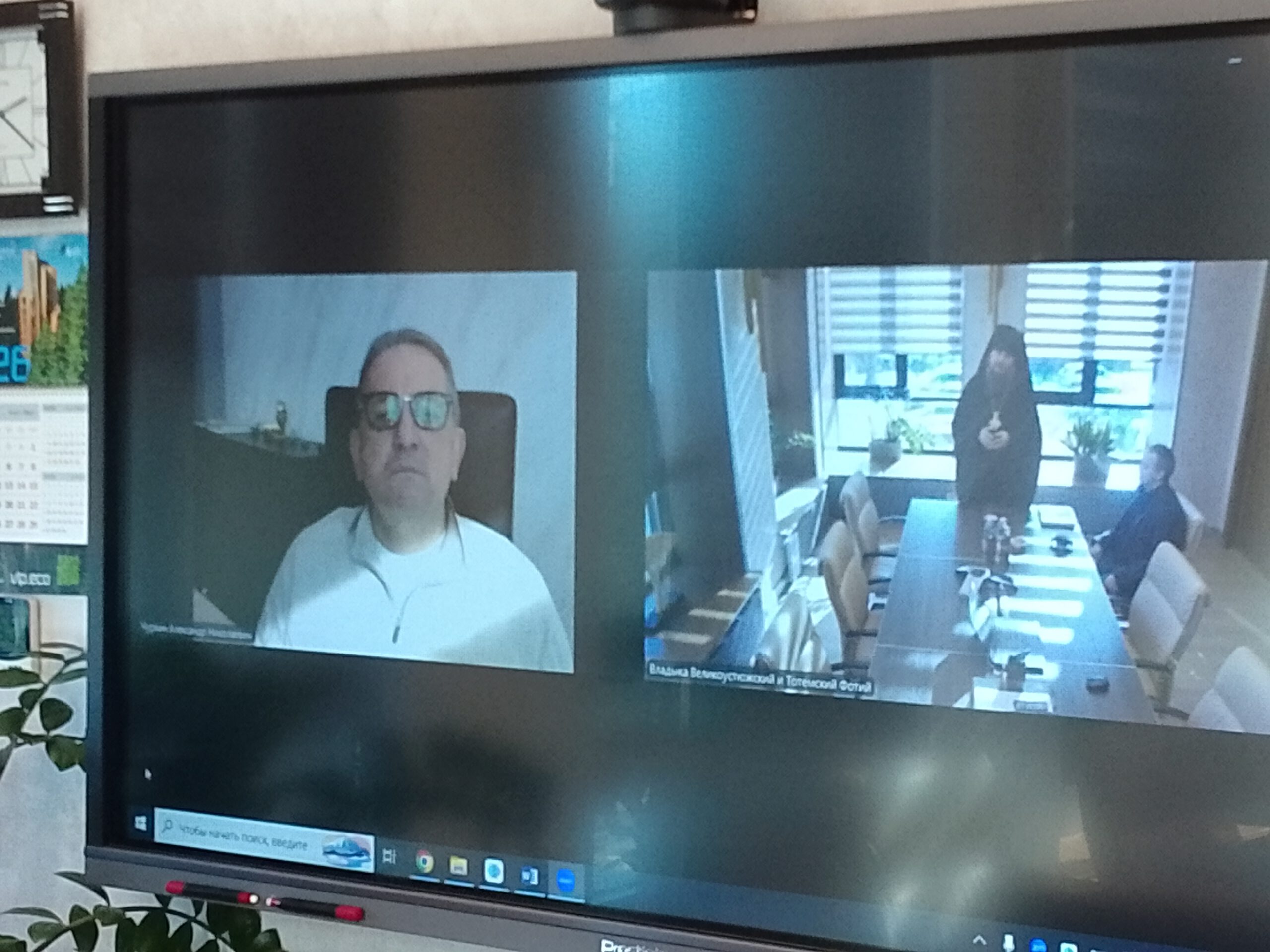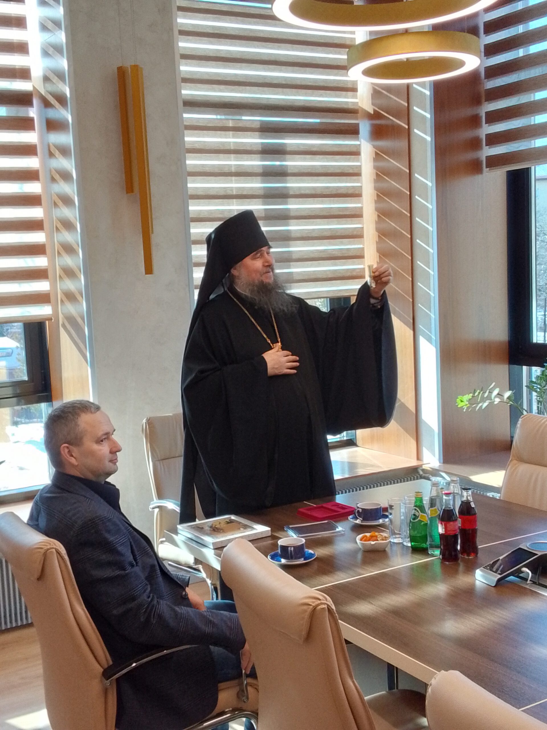 Не застав предпринимателя на месте, архиерей пообщался с Александром Чуркиным по видеосвязи, и передал его сотрудникам награду Великоустюжской епархии — медаль Прокопия Праведного.