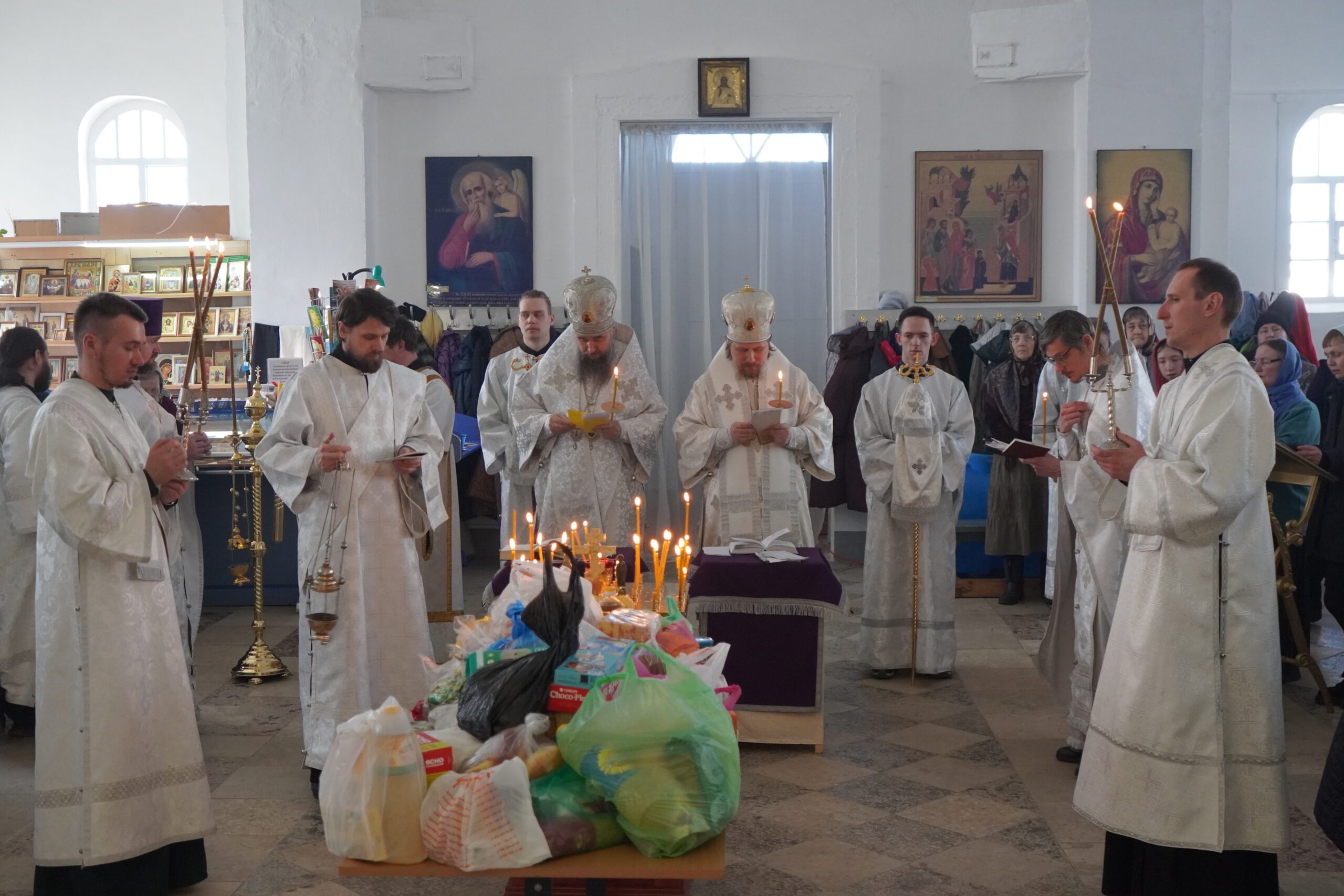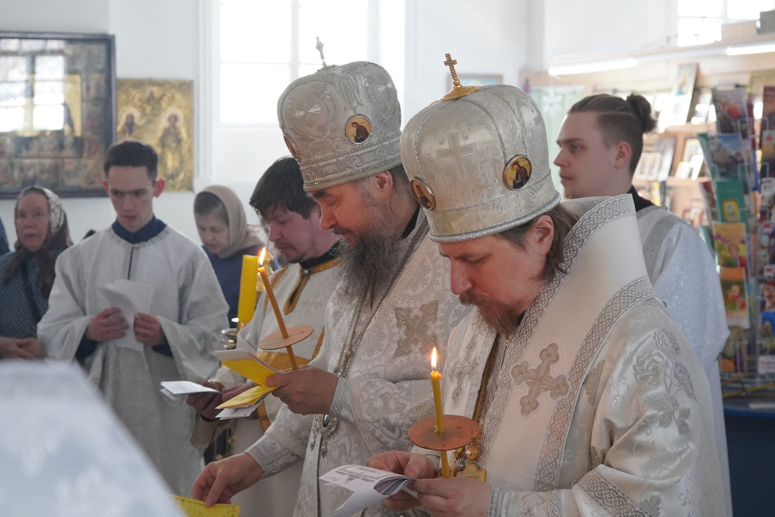 Владыке сослужили: епископ Североморский и Умбский Тарасий, ключарь Прокопьевского собора иерей Вячеслав Бураков, настоятель храма Александра Невского в Кичменгском Городке иерей Олег Викторов, а также диакон Иван Холодилов.
