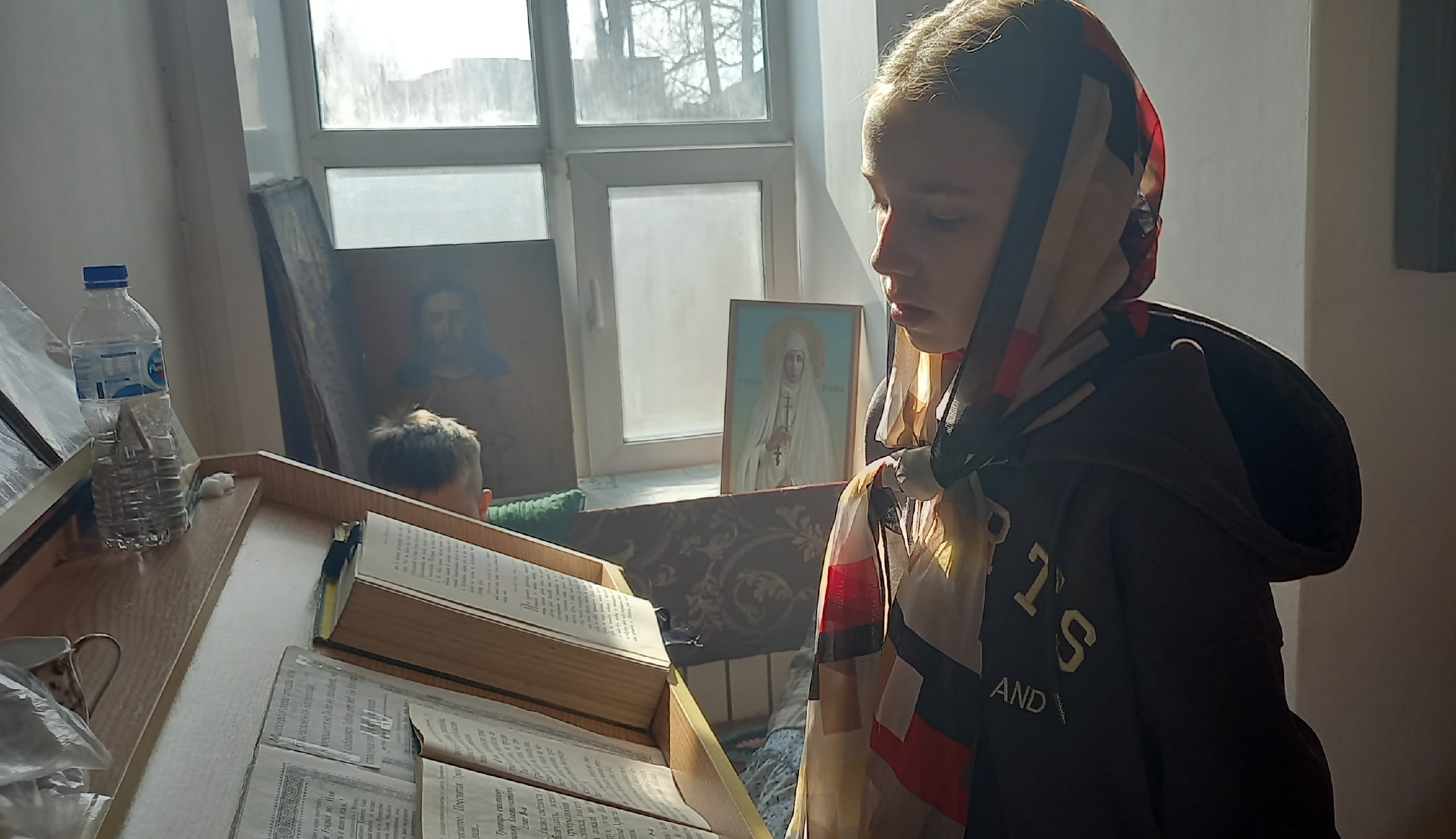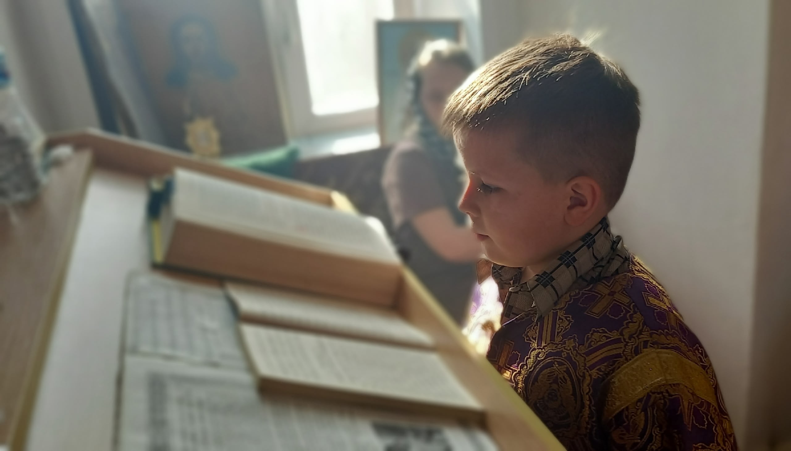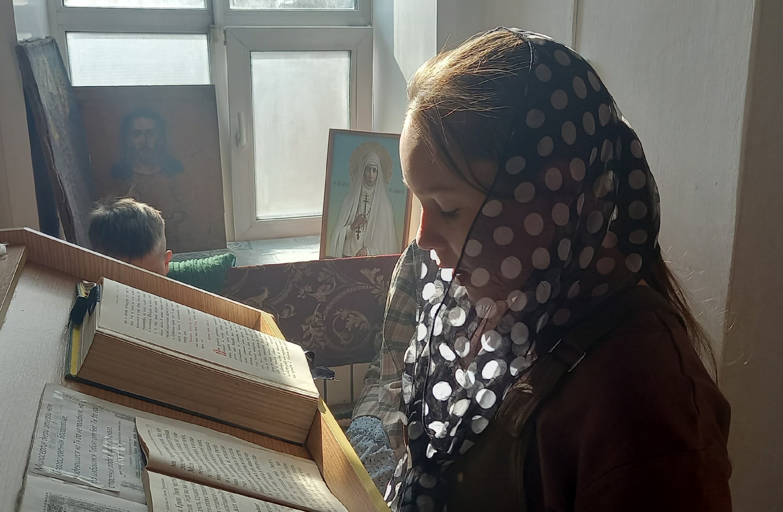 На богослужениях дети обучаются текстам на церковно — славянском языке. По благословению батюшки читают доступные для их возраста молитвы. Изучают шестопсалмие, чтение Псалтири. Обучение и спевки проводятся при поддержке Президентских грантов сохранение исторической памяти проекта «Парус Надежды-Возрождение».