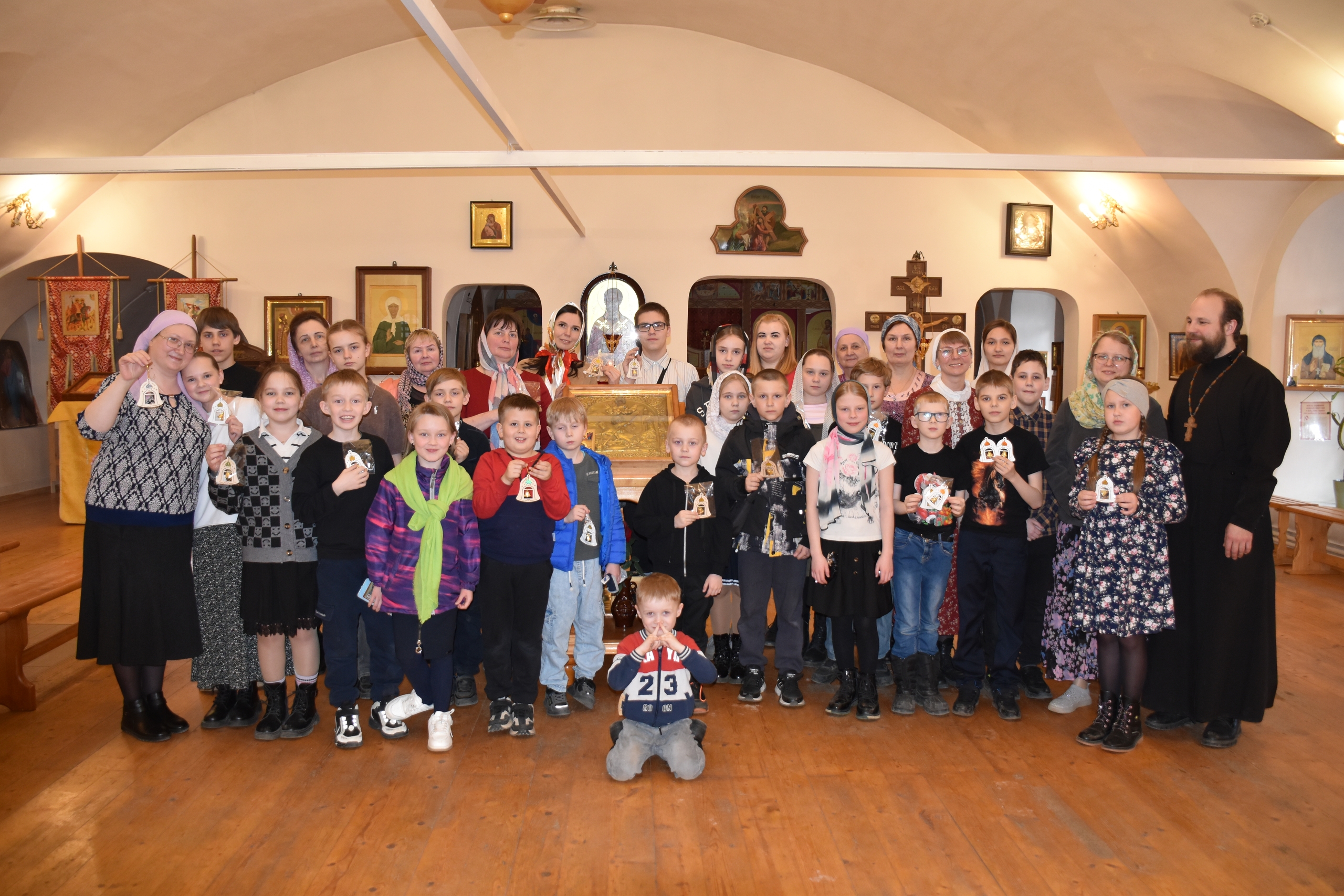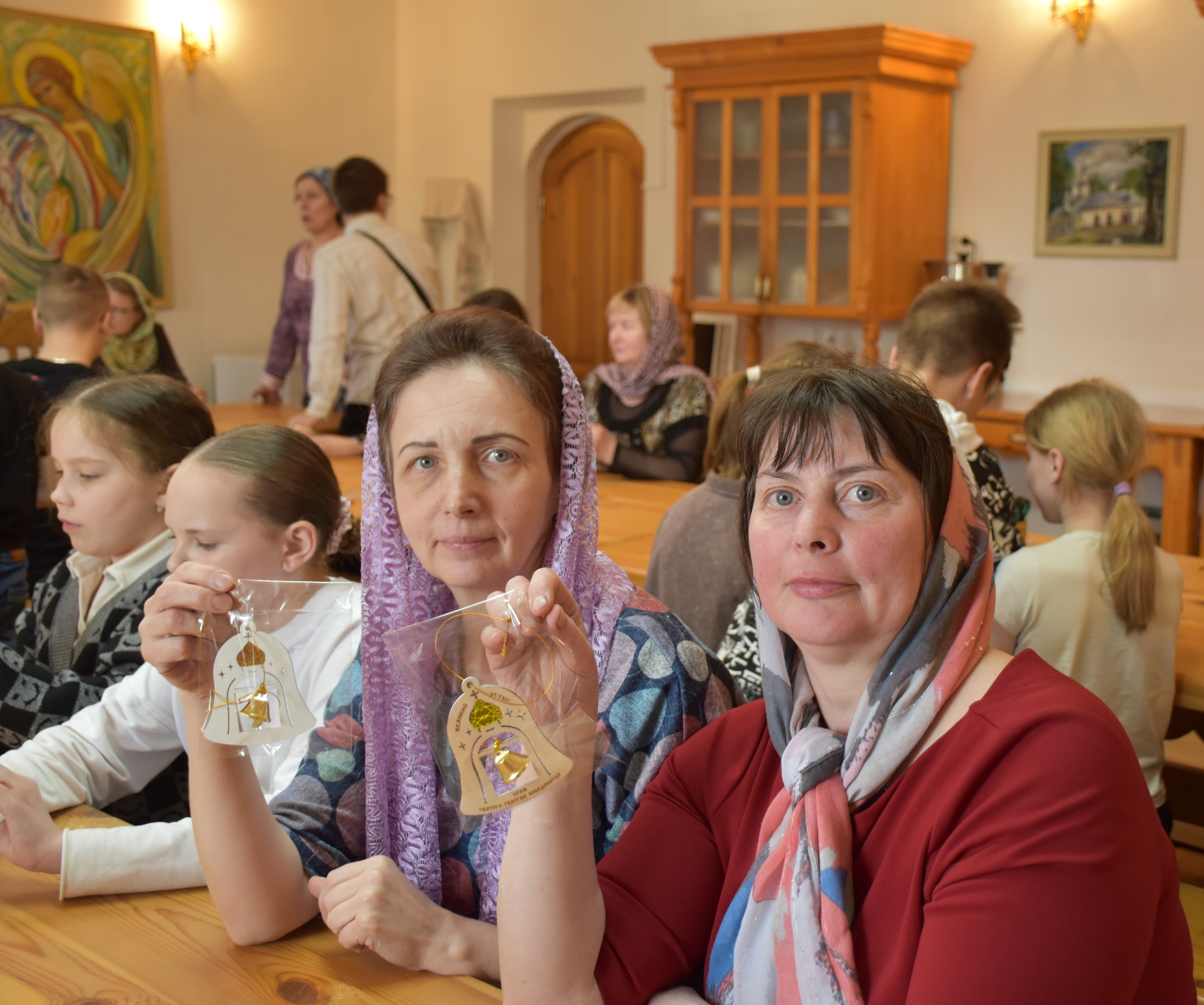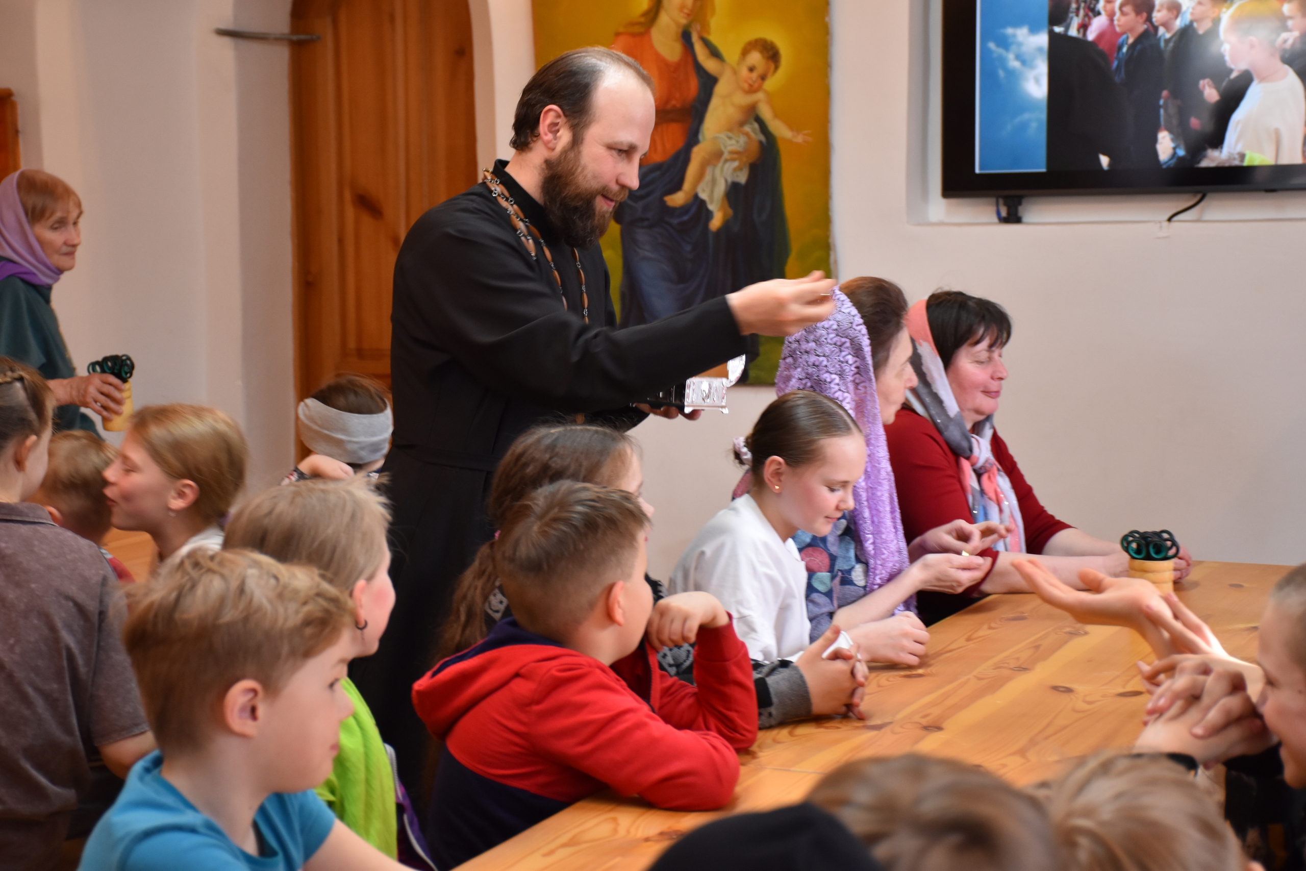Паломников накормили вкусным обедом. Батюшка Феодор провёл экскурсию, познакомил с историей храма. Педагоги воскресной школы провели для всех присутствующих интересное занятие, все вместе мы совершили путешествие в мир колокольного звона и провели мастер — класс по изготовлению колокольчиков. Также для ребят был проведён мастер — класс по колокольному звону Артемием молодым звонарём храма вмч. Георгия Победоносца. Каждый желающих попробовал себя в роли звонаря.