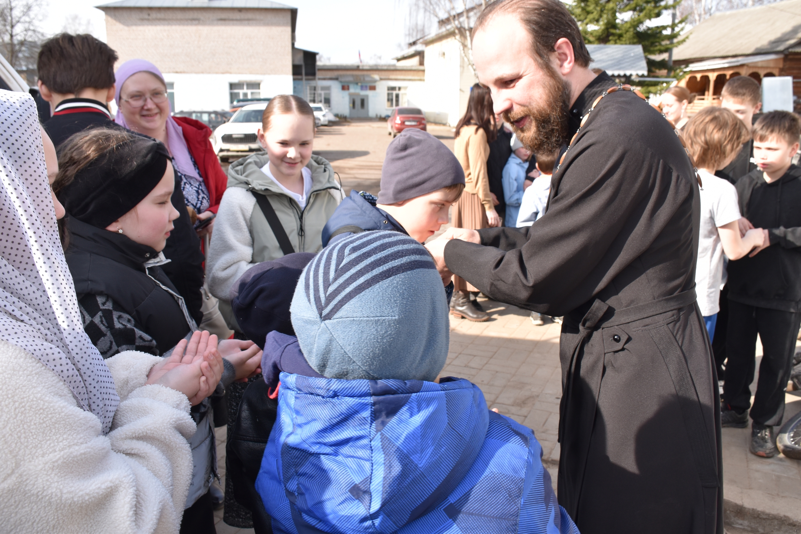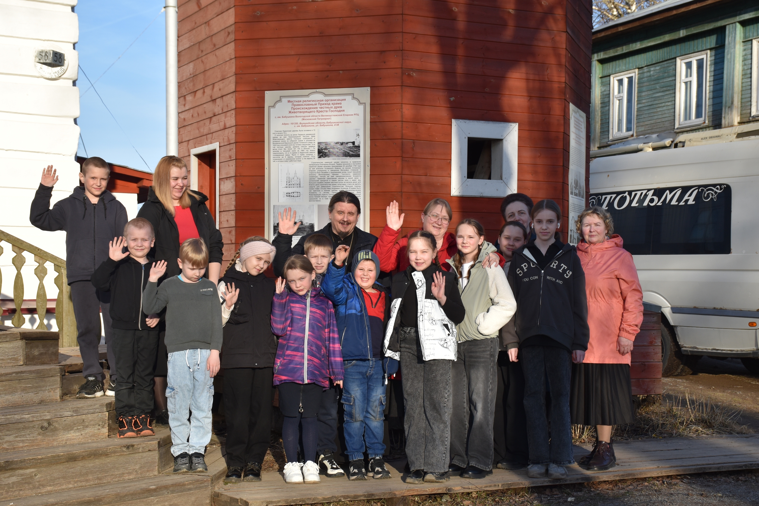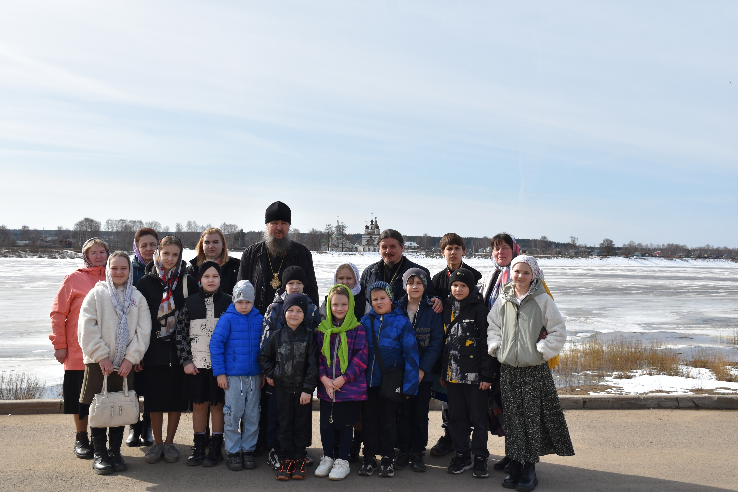 В этот солнечный день на берегу реки Сухоны ребята встретились с епископом Фотием, управляющим Великоустюжской епархией. Владыка пообщался с детьми и подарил каждому паломнику иконочку с изображением святого. Благословил всех нас на благое дело — просвещение подрастающего поколения.