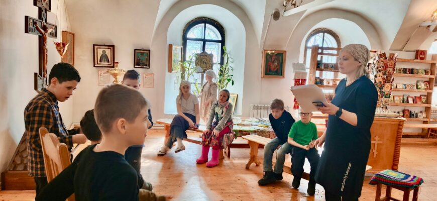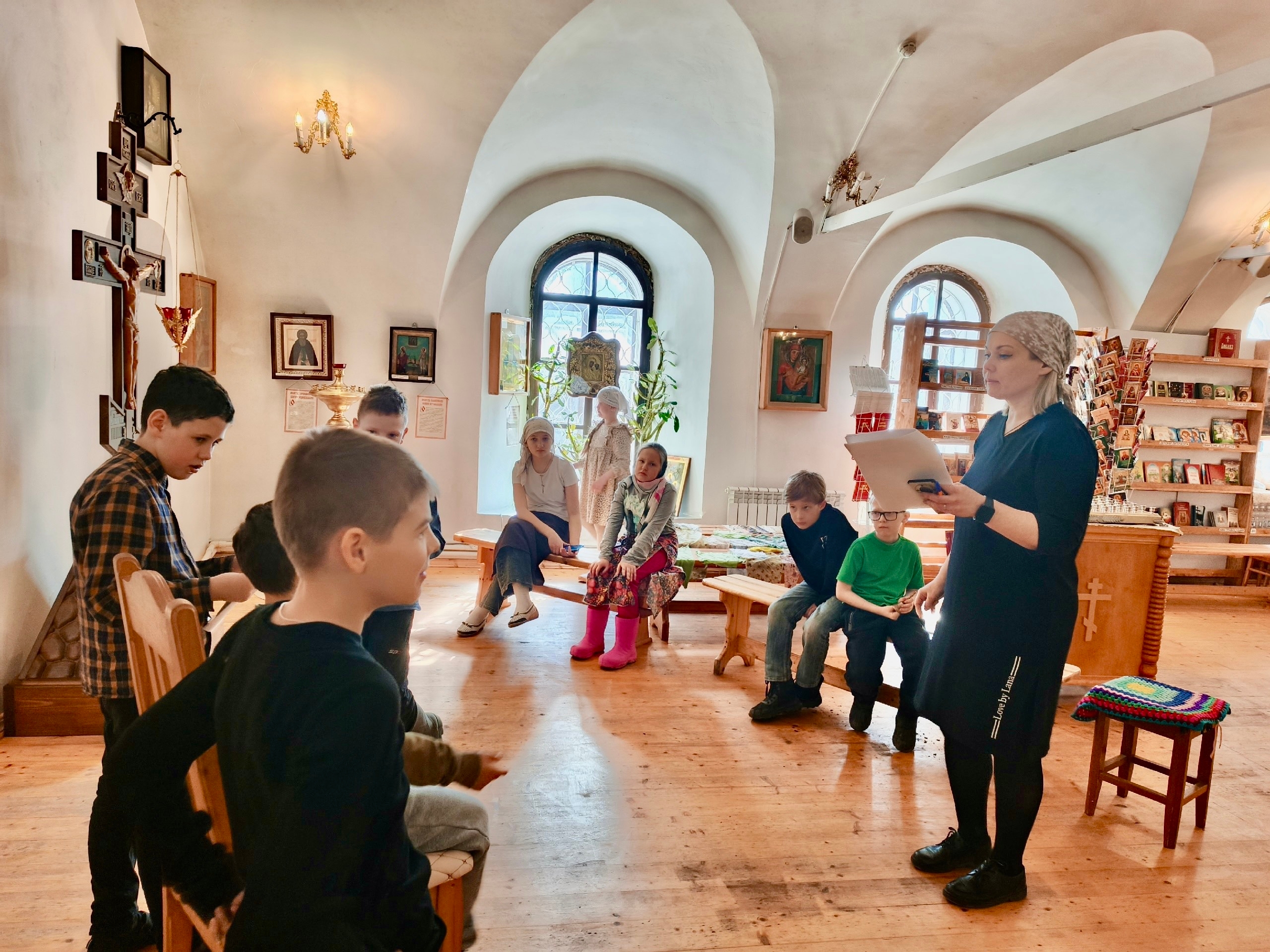 Старшие воспитанники воскресной школы отрабатывали сцены пасхального спектакля. В этот раз они ставили постановку » Королевская Пасха». Ребята по очереди выходили вперёд, читали свои реплики, пробовали разные интонации и жесты. Руководитель театральной группы, Пахомова Анастасия Александровна, давала советы: показывала, как лучше двигаться, как передавать нужные эмоции, чтобы зрители почувствовали всю глубину истории.