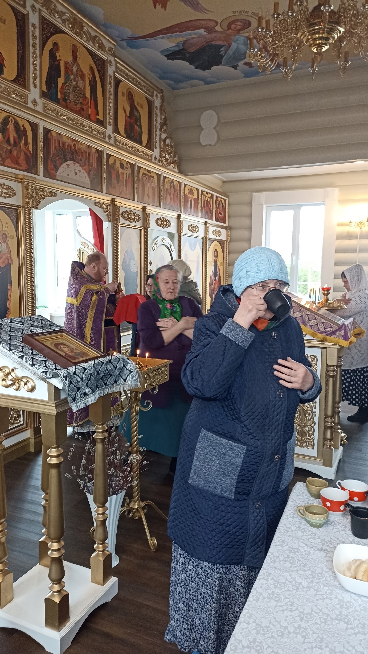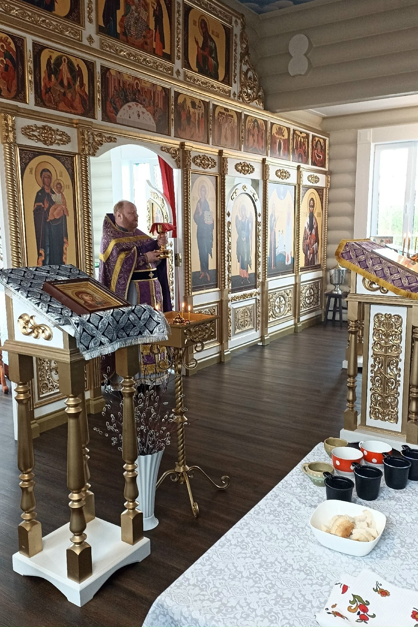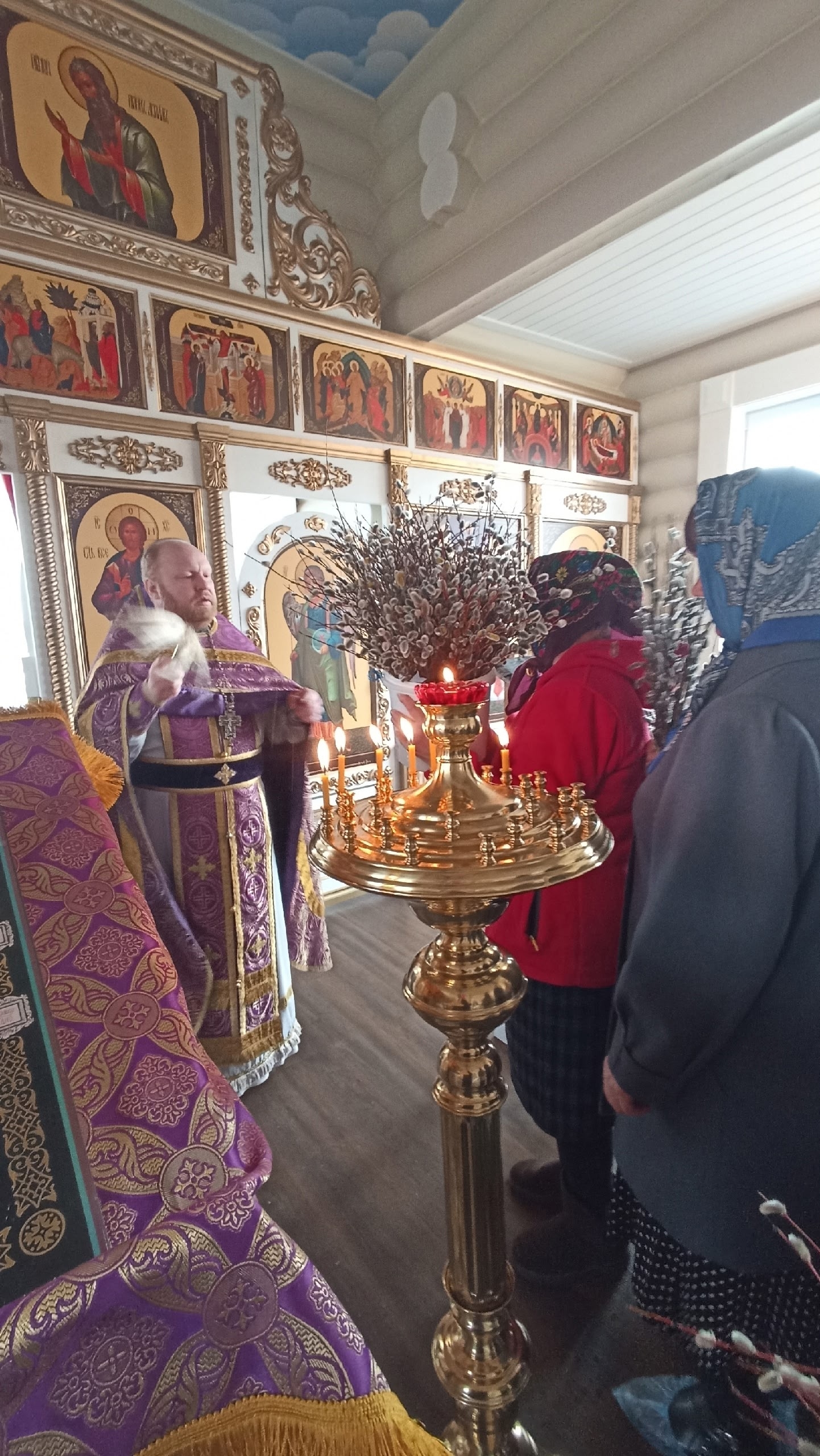 В Лазареву субботу устюжский благочинный протоиерей Дмитрий Фомин, посетил храм праведных Иоанна и Марии Устюжских в селе Усть-Алексеево, где совершил Божественную литургию, провел исповедь, причастие, и освящение вербы.